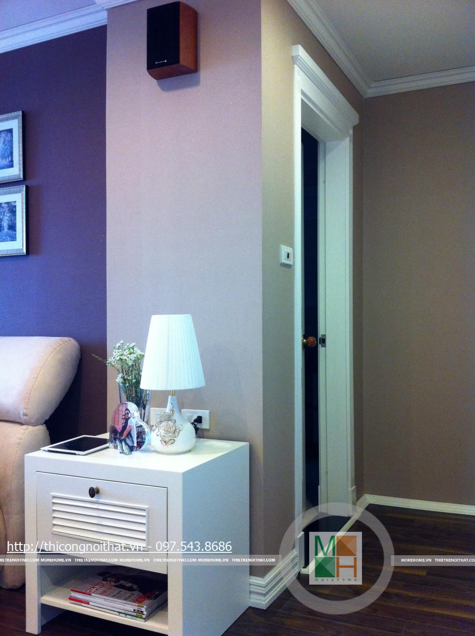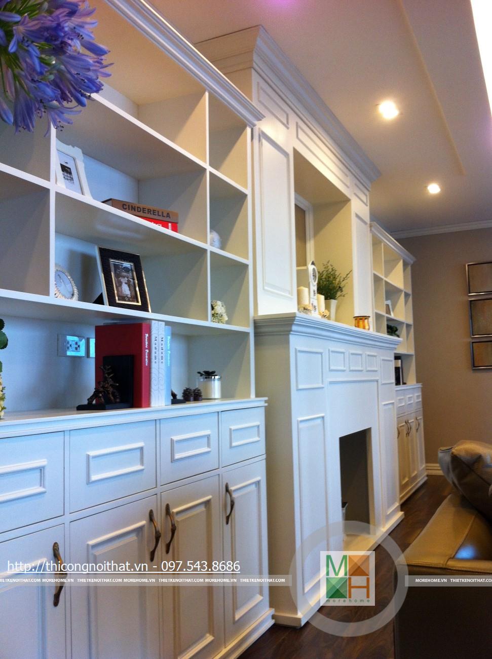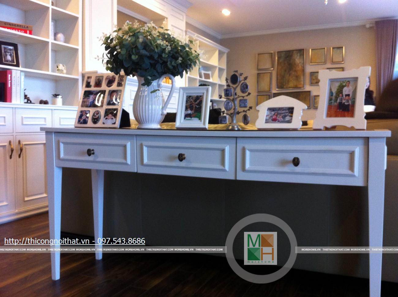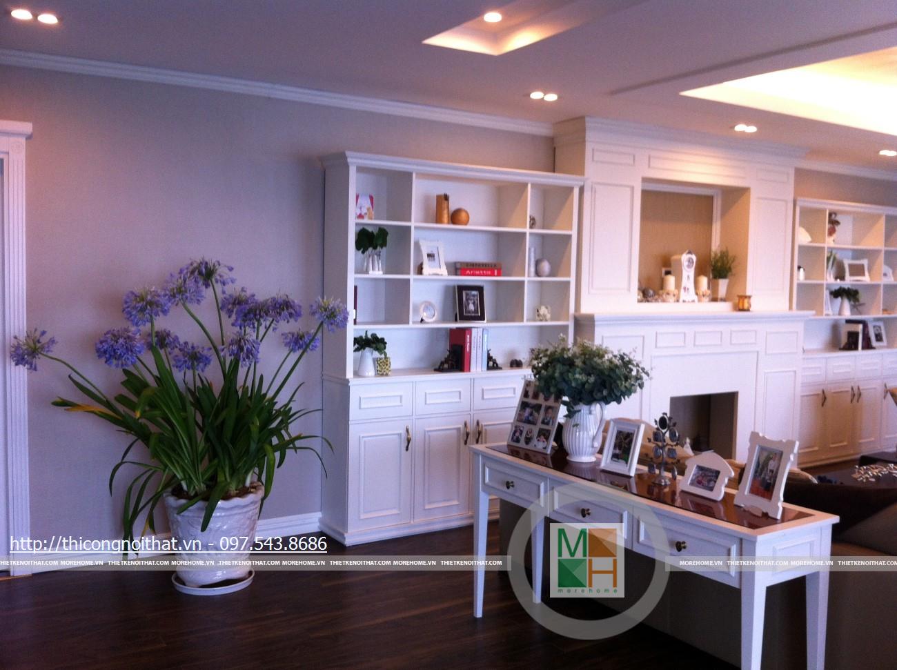 Hai bên chiếc tủ này là 2 kệ đựng đồ với những ngăn ô nhỏ giúp phân chia khu vực đặt đồ trang trí và ở dưới là ngăn tủ kín đựng các vật dụng không muốn trưng bày ra ngoài. Ngay cạnh chiếc ghế bành sofa dài là chiếc bàn trắng nhỏ trên có đặt lọ hoa xinh xắn với các bức tranh lưu niệm. Toát lên trên toàn bộ phòng khách là màu trắng tinh khôi song được tạo điểm nhấn bởi màu sắc của hoa, của bàn ghế, của những chiếc gối ôm.