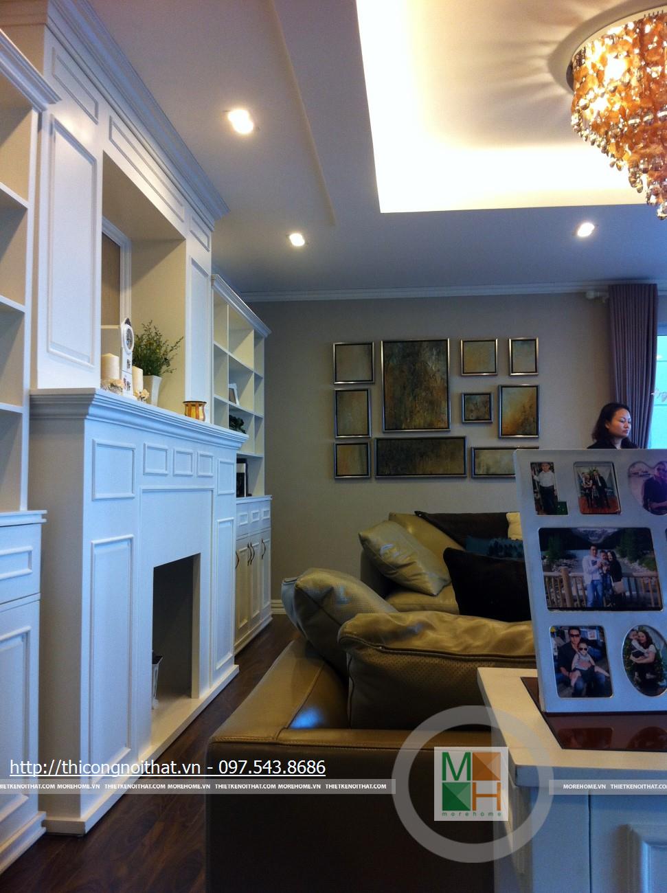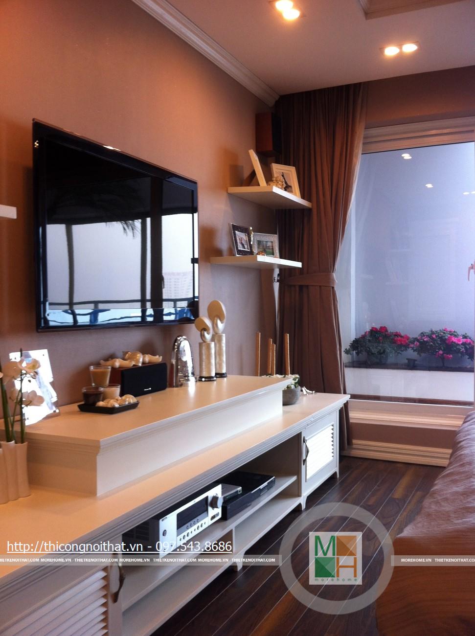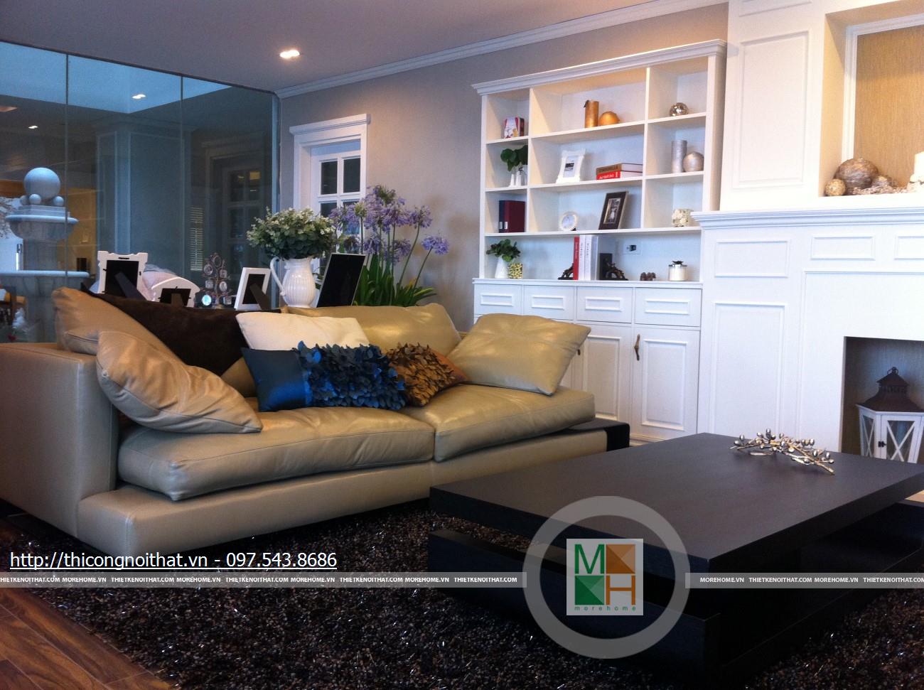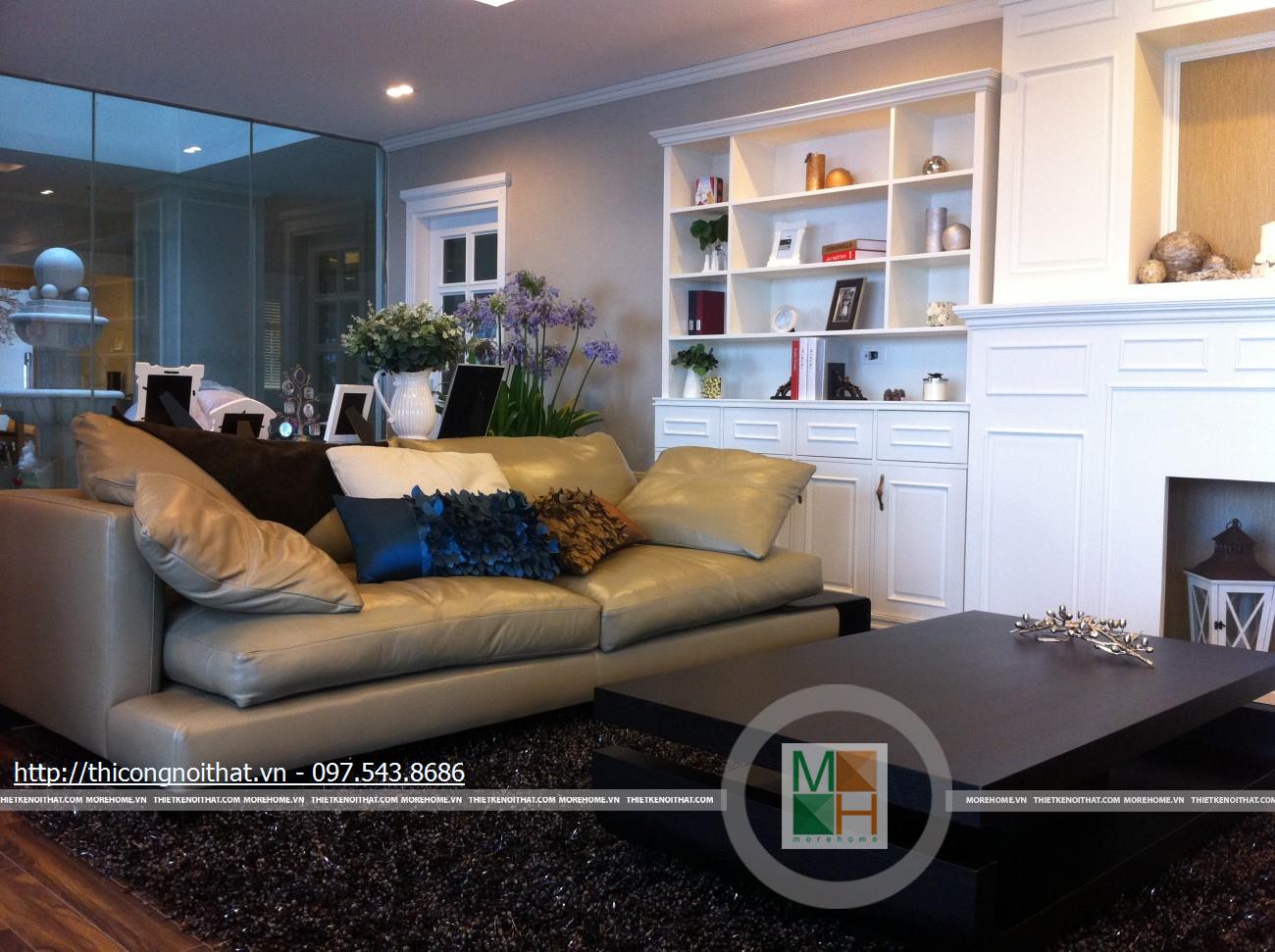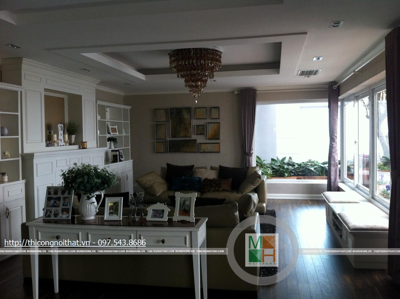 Hai bên chiếc tủ này là 2 kệ đựng đồ với những ngăn ô nhỏ giúp phân chia khu vực đặt đồ trang trí và ở dưới là ngăn tủ kín đựng các vật dụng không muốn trưng bày ra ngoài. Ngay cạnh chiếc ghế bành sofa dài là chiếc bàn trắng nhỏ trên có đặt lọ hoa xinh xắn với các bức tranh lưu niệm. Toát lên trên toàn bộ phòng khách là màu trắng tinh khôi song được tạo điểm nhấn bởi màu sắc của hoa, của bàn ghế, của những chiếc gối ôm.