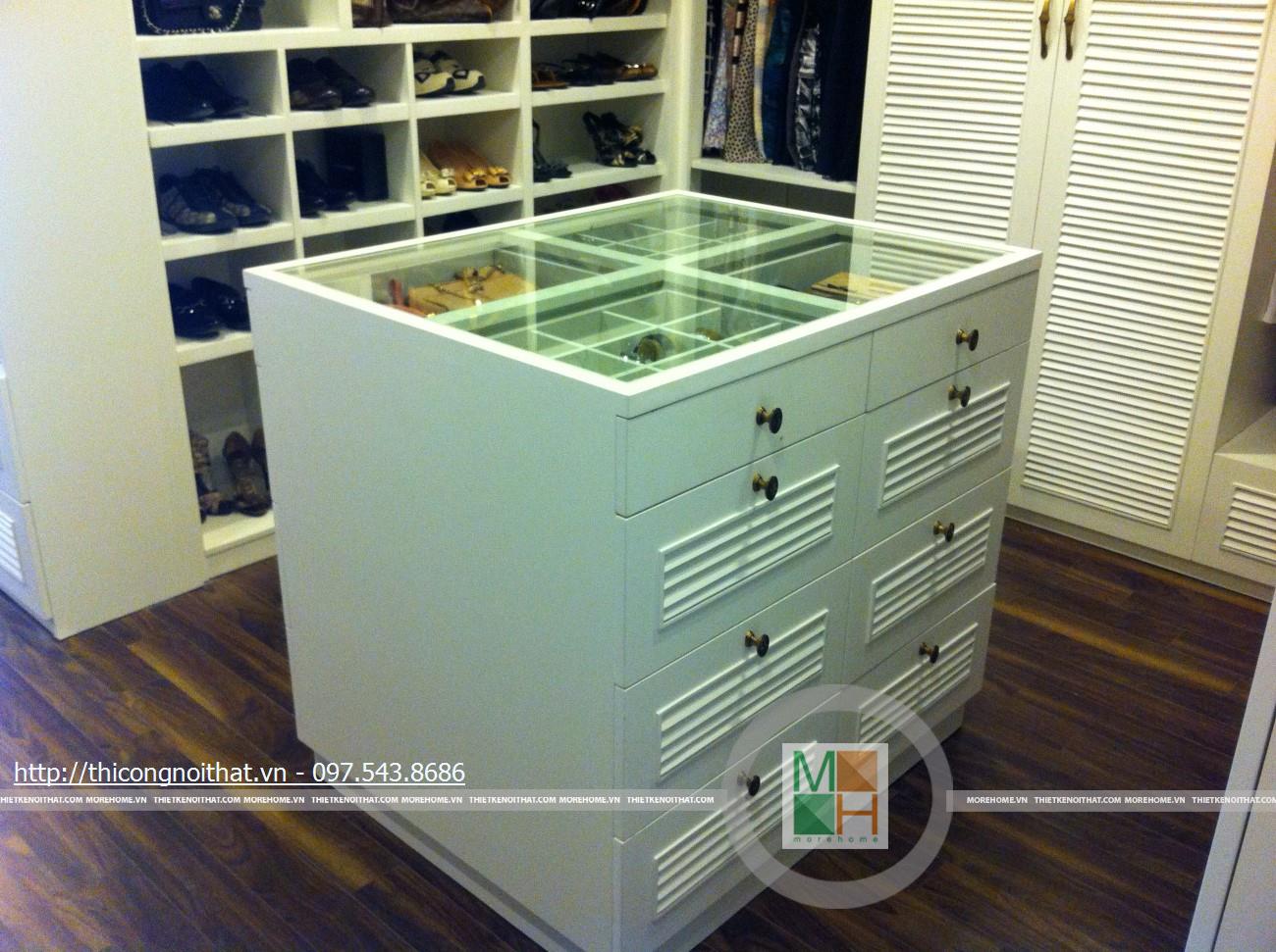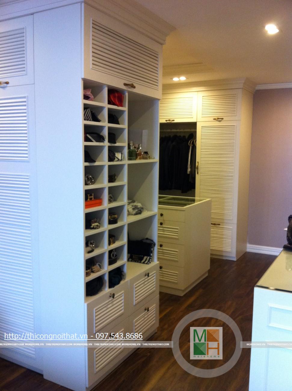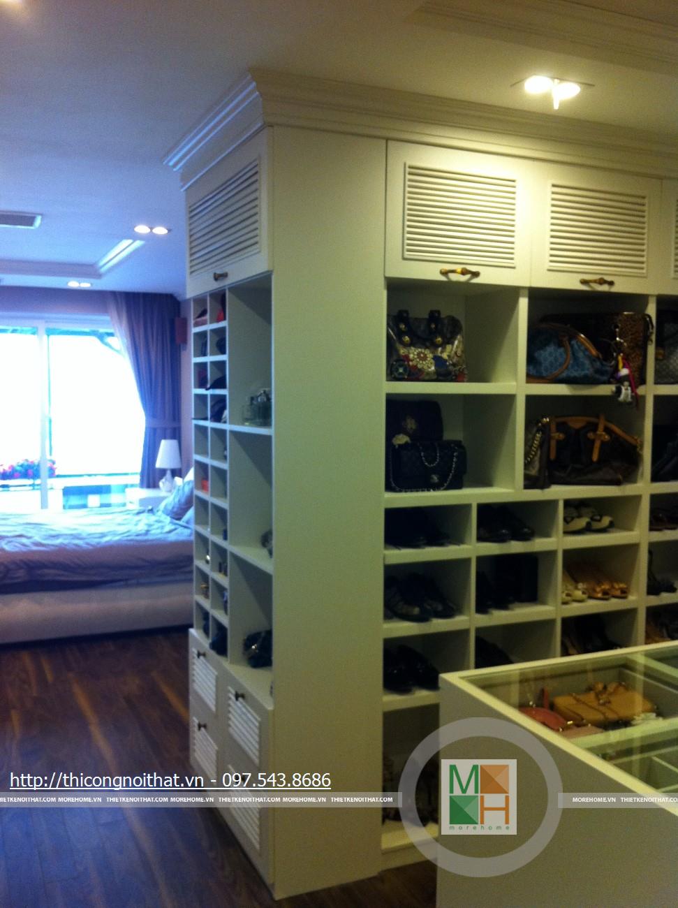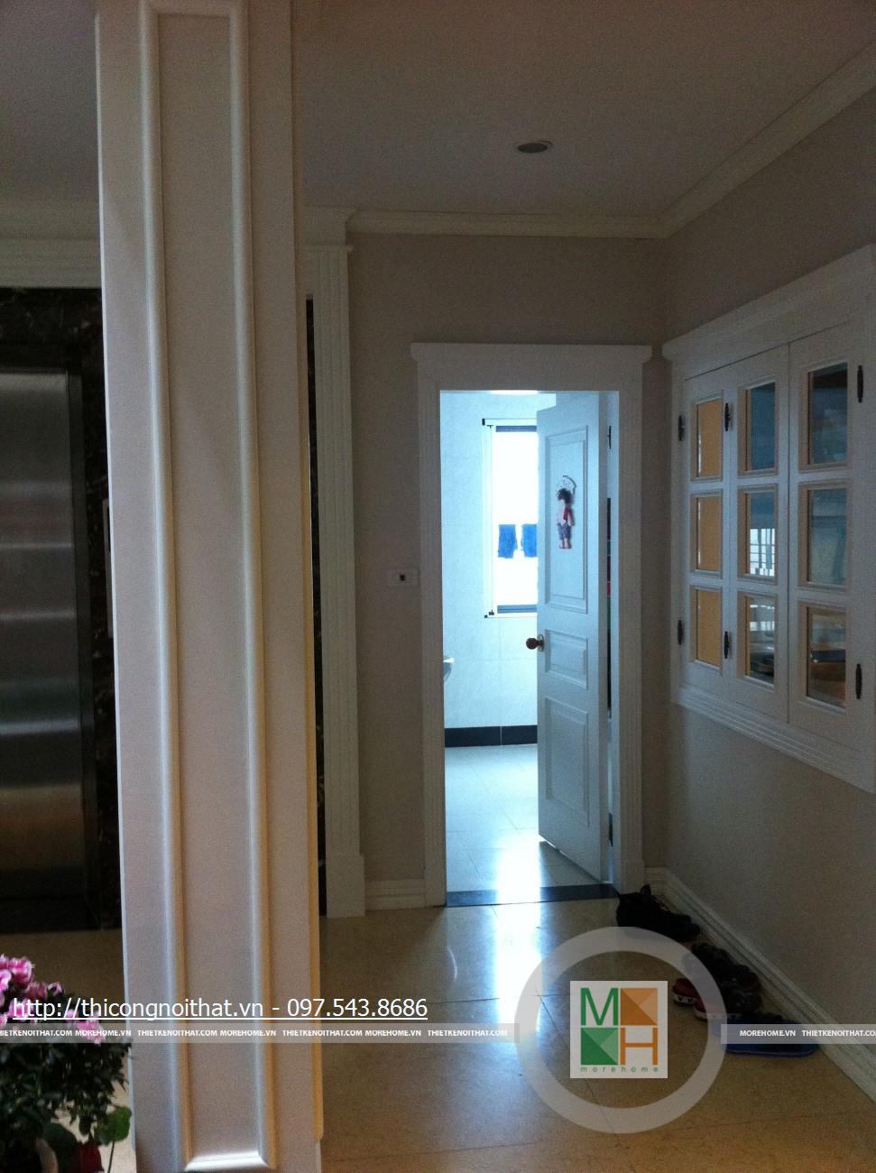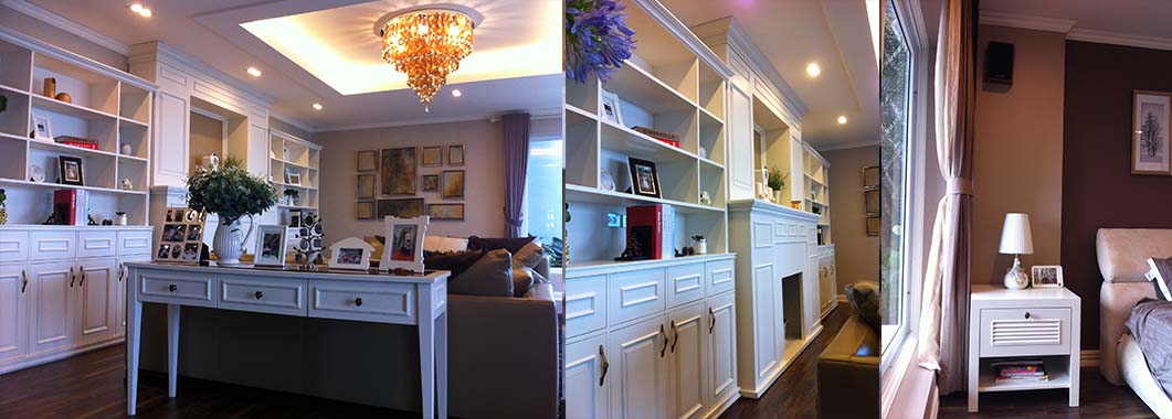 Hai bên chiếc tủ này là 2 kệ đựng đồ với những ngăn ô nhỏ giúp phân chia khu vực đặt đồ trang trí và ở dưới là ngăn tủ kín đựng các vật dụng không muốn trưng bày ra ngoài. Ngay cạnh chiếc ghế bành sofa dài là chiếc bàn trắng nhỏ trên có đặt lọ hoa xinh xắn với các bức tranh lưu niệm. Toát lên trên toàn bộ phòng khách là màu trắng tinh khôi song được tạo điểm nhấn bởi màu sắc của hoa, của bàn ghế, của những chiếc gối ôm.