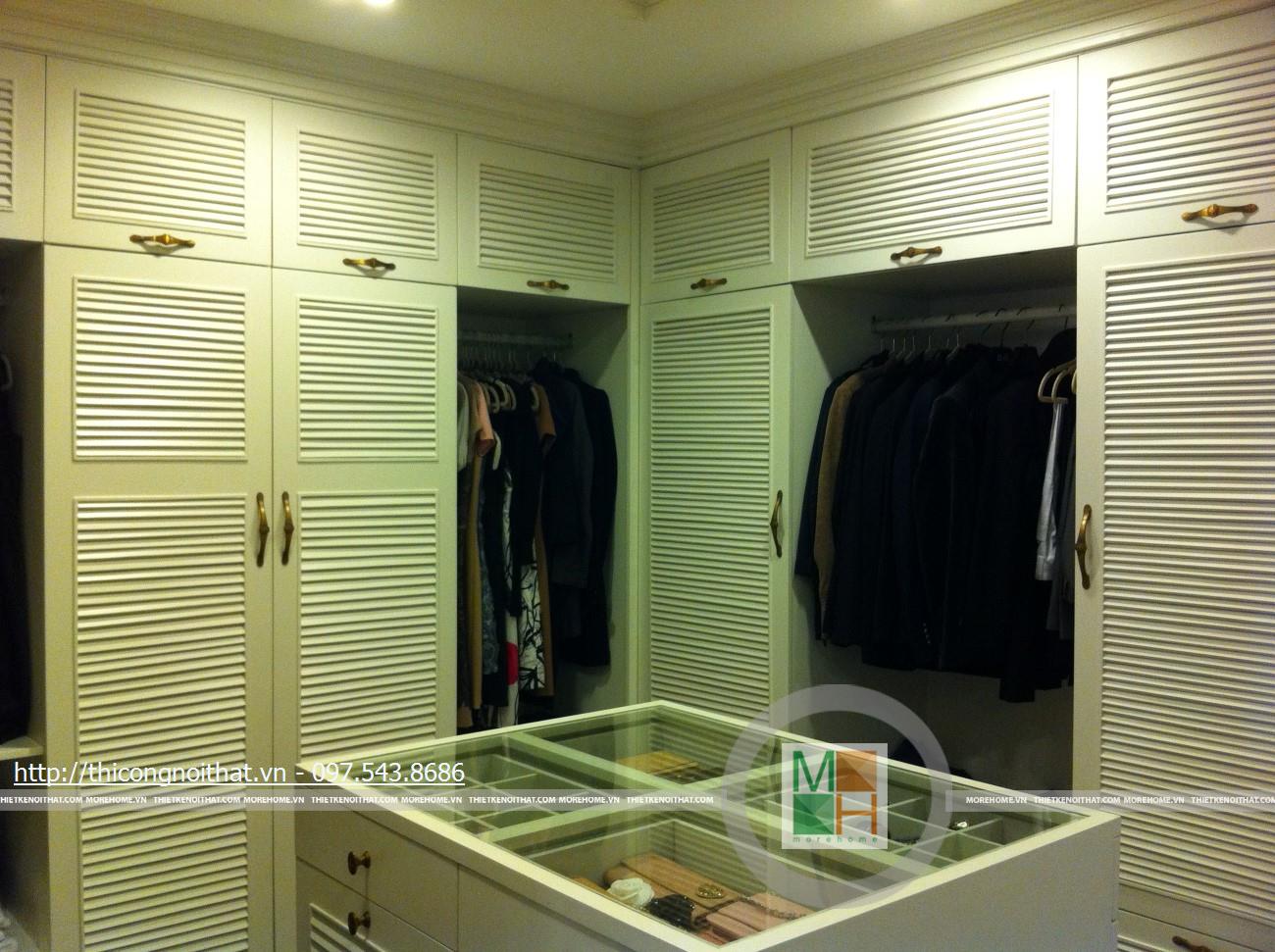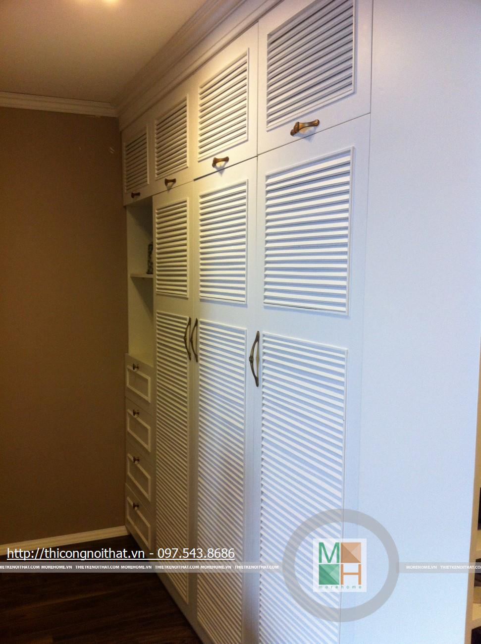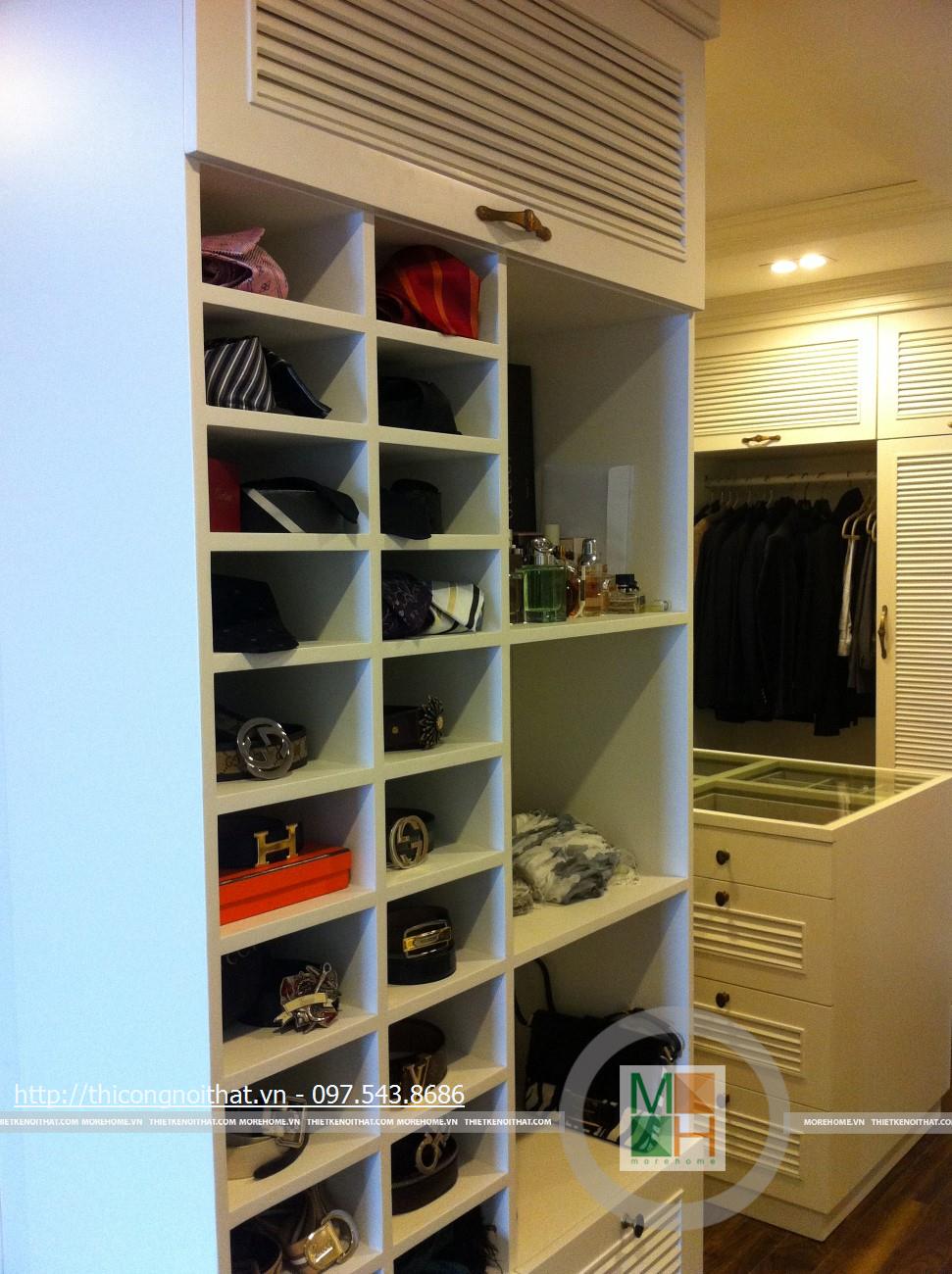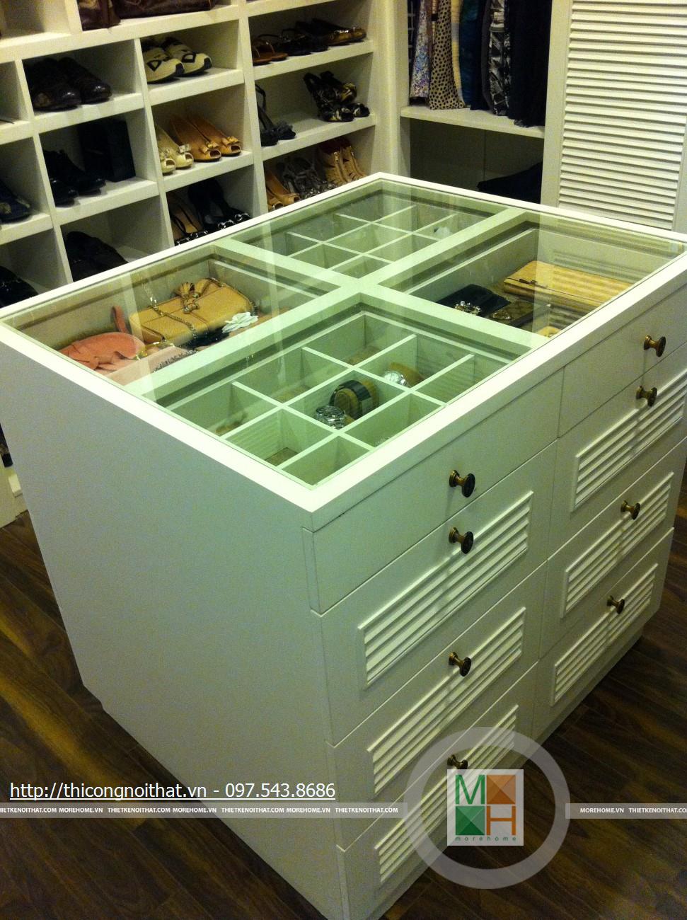 Hai bên chiếc tủ này là 2 kệ đựng đồ với những ngăn ô nhỏ giúp phân chia khu vực đặt đồ trang trí và ở dưới là ngăn tủ kín đựng các vật dụng không muốn trưng bày ra ngoài. Ngay cạnh chiếc ghế bành sofa dài là chiếc bàn trắng nhỏ trên có đặt lọ hoa xinh xắn với các bức tranh lưu niệm. Toát lên trên toàn bộ phòng khách là màu trắng tinh khôi song được tạo điểm nhấn bởi màu sắc của hoa, của bàn ghế, của những chiếc gối ôm.