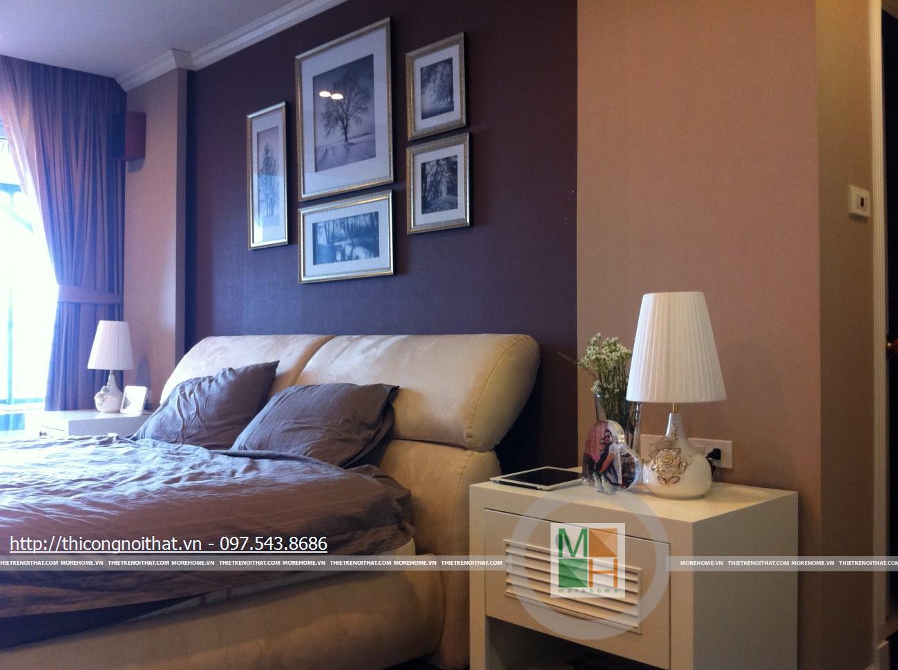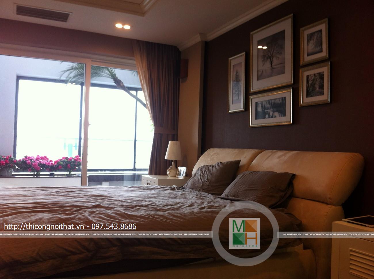 Những bức tranh bắt mắt lại 1 lần nữa xuất hiện trong không gian phòng ngủ. Vẫn là những bức tranh đủ kiểu dáng nhưng ở đây nó có cùng chủ đề về thiên nhiên, cây cối, phong cảnh và được đặt cân xứng ngay trên đầu giường. Màu nâu, màu xám, màu trắng là những gam màu chủ đạo trong phòng ngủ tạo nên sự sinh động và cảm giác ấm cúng mỗi khi bước vào đây.