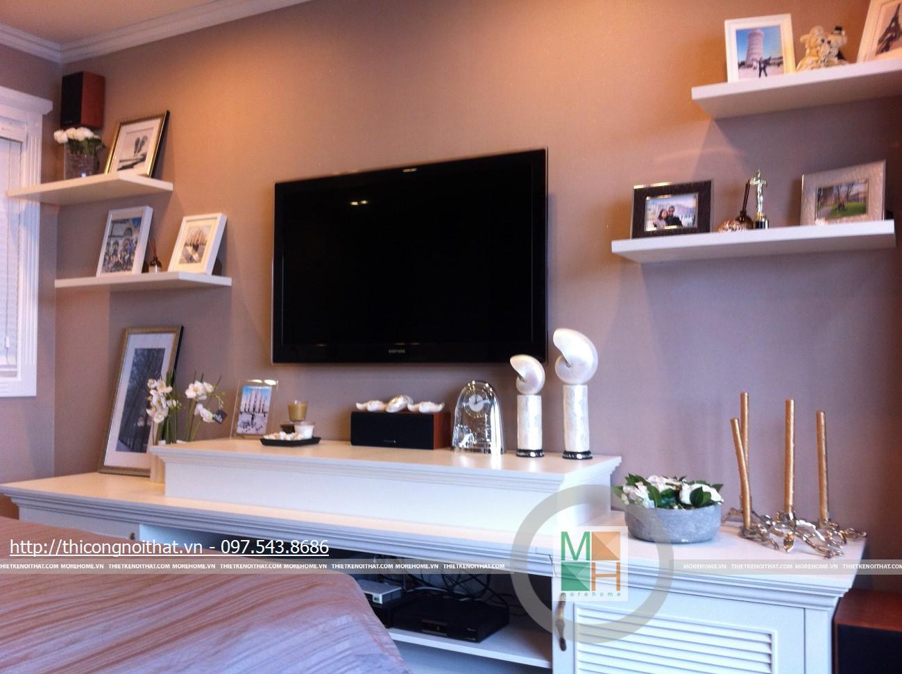 Không giống như bất cứ ngôi nhà hay bất cứ không gian phòng ngủ nào khác, nơi đây có sự mới lạ trong thiết kế và cách bài trí đồ đạc, khung cảnh. Đầu tiên phải kể đến là sự xuất hiện của kệ đựng đồ đặt 2 bên ti vi. Nói là kệ nhưng thực ra nó có thiết kế cực kì đơn giản với 2 bậc ngăn đặt song song và so le 2 bên. Chính sự đơn giản này lại khiến nhiều người chú ý hơn cả và cũng là nét độc đáo riêng trong gu thẩm mỹ của gia chủ.