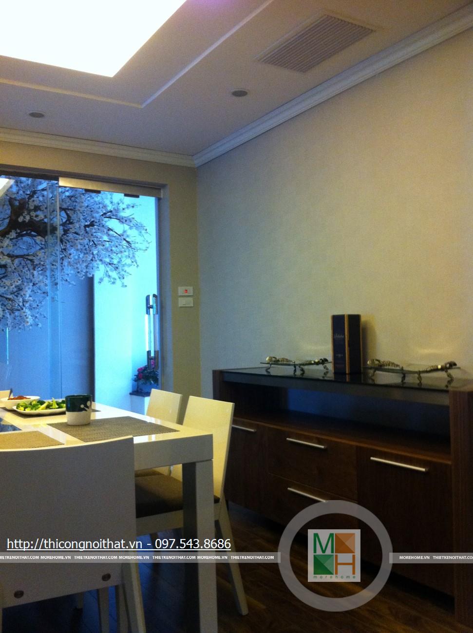 Chiếc bàn gỗ màu nâu đen được đặt ở giữa 2 bên ghế có thiết kế không thể đơn giản hơn. Sự phối kết hợp của bộ sofa và chiếc bàn gỗ này tạo nên sự mới lạ và ấn tượng rất riêng, thể hiện gu thẩm mỹ khác biệt của gia chủ. Nội thất phòng khách còn có sự hiện diện của rất nhiều đồ đạc khác, nó vừa có chức năng làm đẹp, vừa phục vụ cho nhu cầu sinh hoạt của gia chủ. Đó là chiếc tủ và kệ đựng đồ đặt 2 bên tủ, tất cả đều có màu trắng nhẹ nhàng. Điều đặc biệt ở đây là chiếc tủ đựng đồ có thiết kế không giống như bất cứ chiếc tủ nào. Nếu theo lẽ thường tủ sẽ có các ngăn đựng đồ ở dưới và trên đặt ti vi song chiếc tủ này không thế. Tủ này có phía dưới cũng là ngăn tủ nhưng lại có khoảng trống ở giữa để tạo điểm nhấn. Thẳng lên trên khoảng trống này cũng là 1 khoảng trống nữa nhưng to hơn chút để gia chủ có thể chậu hoa nhỏ, đồng hồ, đồ lưu niệm hay các vật trang trí ở đây.