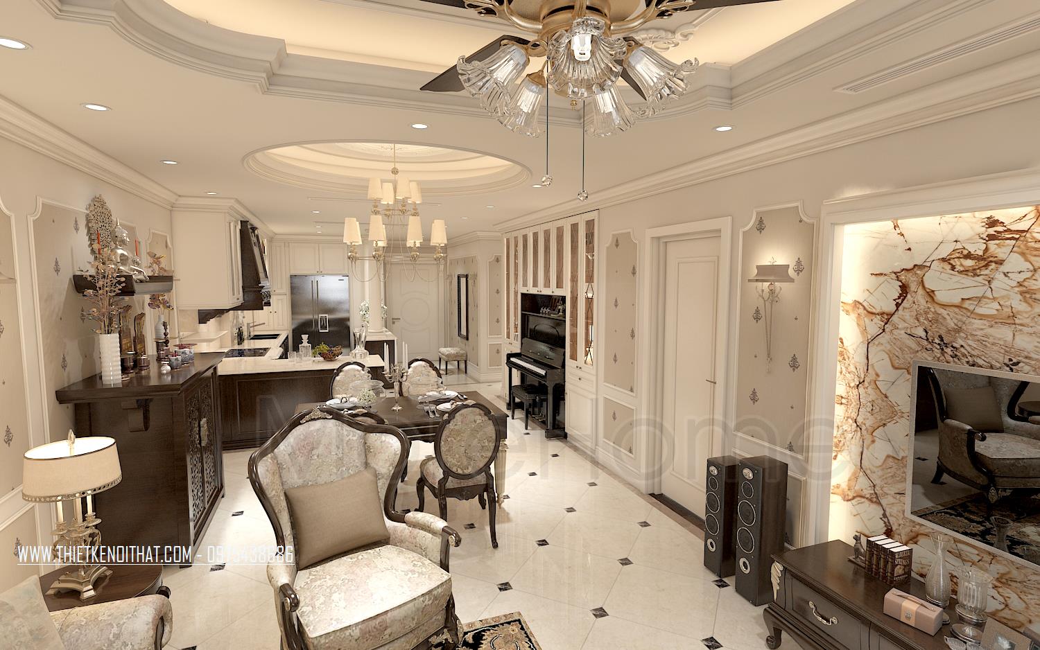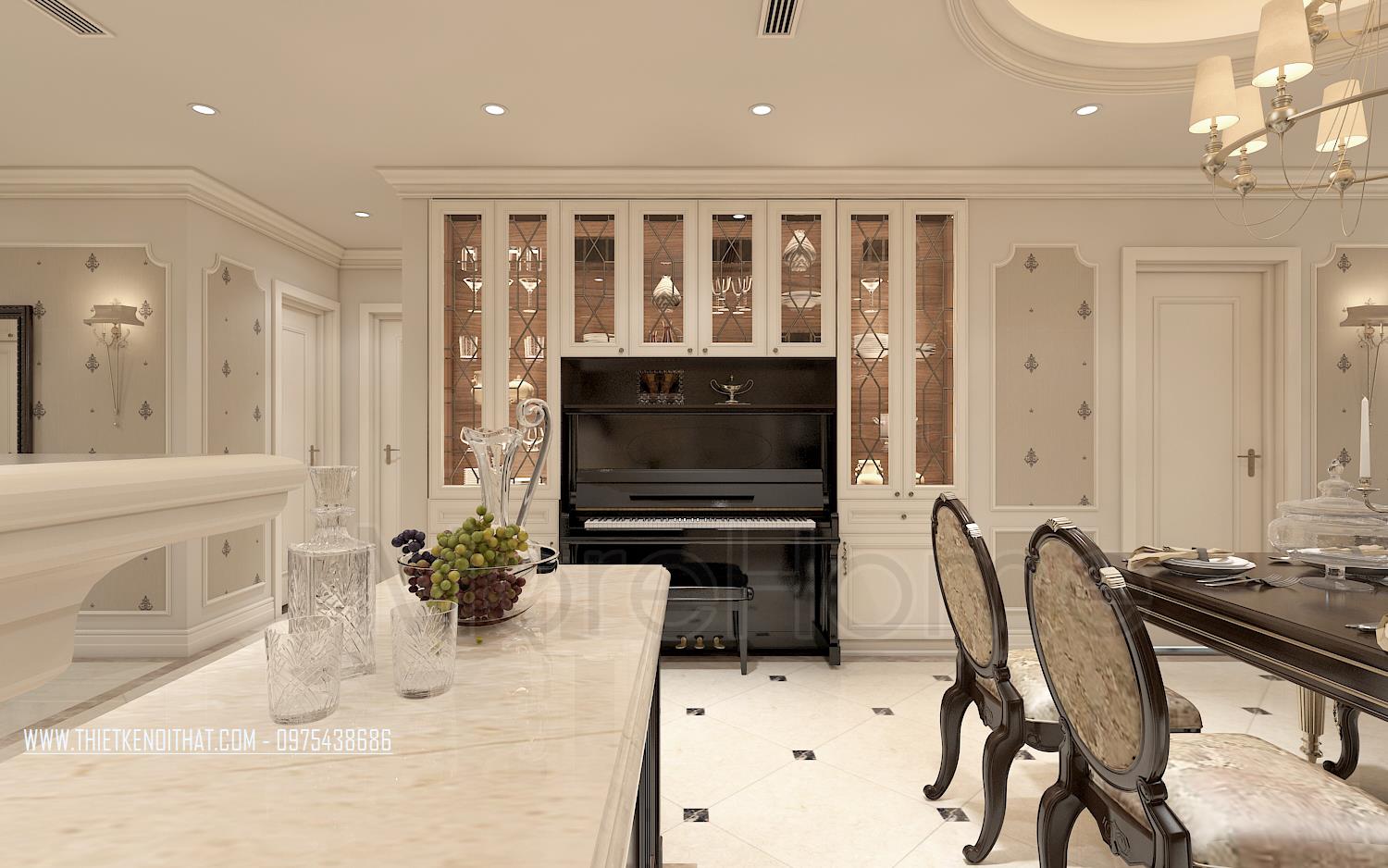 Liền kề phòng khách với phong cách tân cổ điển, đây là gian phòng ăn với bộ bàn gỗ tinh tế sang trọng là nơi để gia chủ cùng gia đình thưởng thức những bữa ăn ngon. Thiết kế bàn gỗ với chân bàn bằng nhôm với thiết kế cách điệu càng tăng thêm phần thanh cao và tinh tế cho căn phòng. Chiếc đàn piano cổ điển được đặt khéo léo bên cạnh phòng ăn với màu gỗ tương đồng với màu gỗ bàn ăn tạo sự đồng điệu và kết nối giữa các trang bị nội thất trong căn nhà.