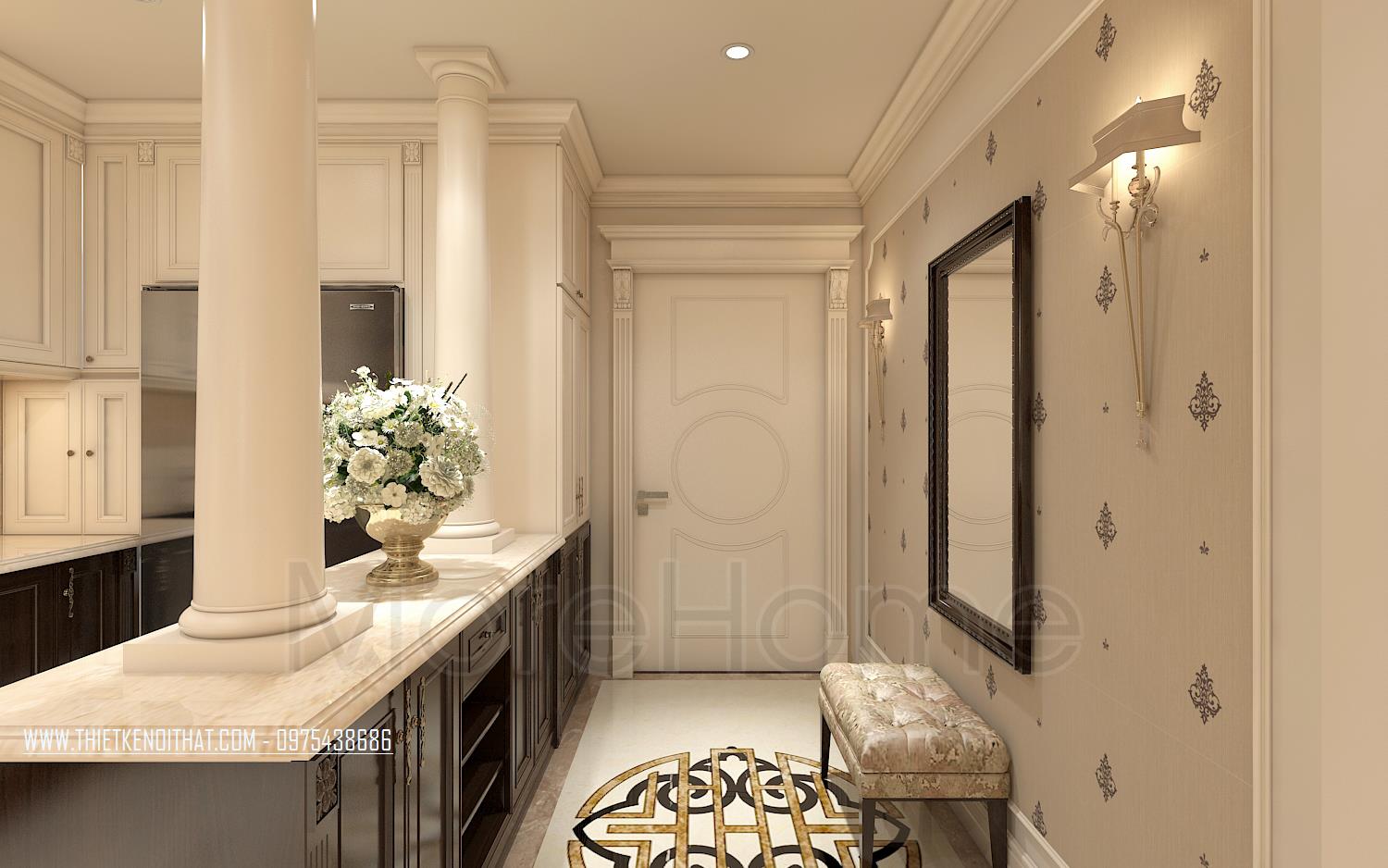 Trước đó khi bước vào nhà để đến với phòng bếp phong cách tân cổ điển rồi xa ra phòng khách là hành lang nho nhỏ, kiến trúc sư đã khéo léo đặt các tủ để giày âm tường với màu gỗ đồng màu trong phòng khách và phòng ăn. Ngoài ra chiếc ghế trang trí với hoa văn cùng với hoa văn sofa phòng khách là nơi để mỗi người dừng chân đi giày cũng góp phần tạo không khí sang trọng cho căn nhà.