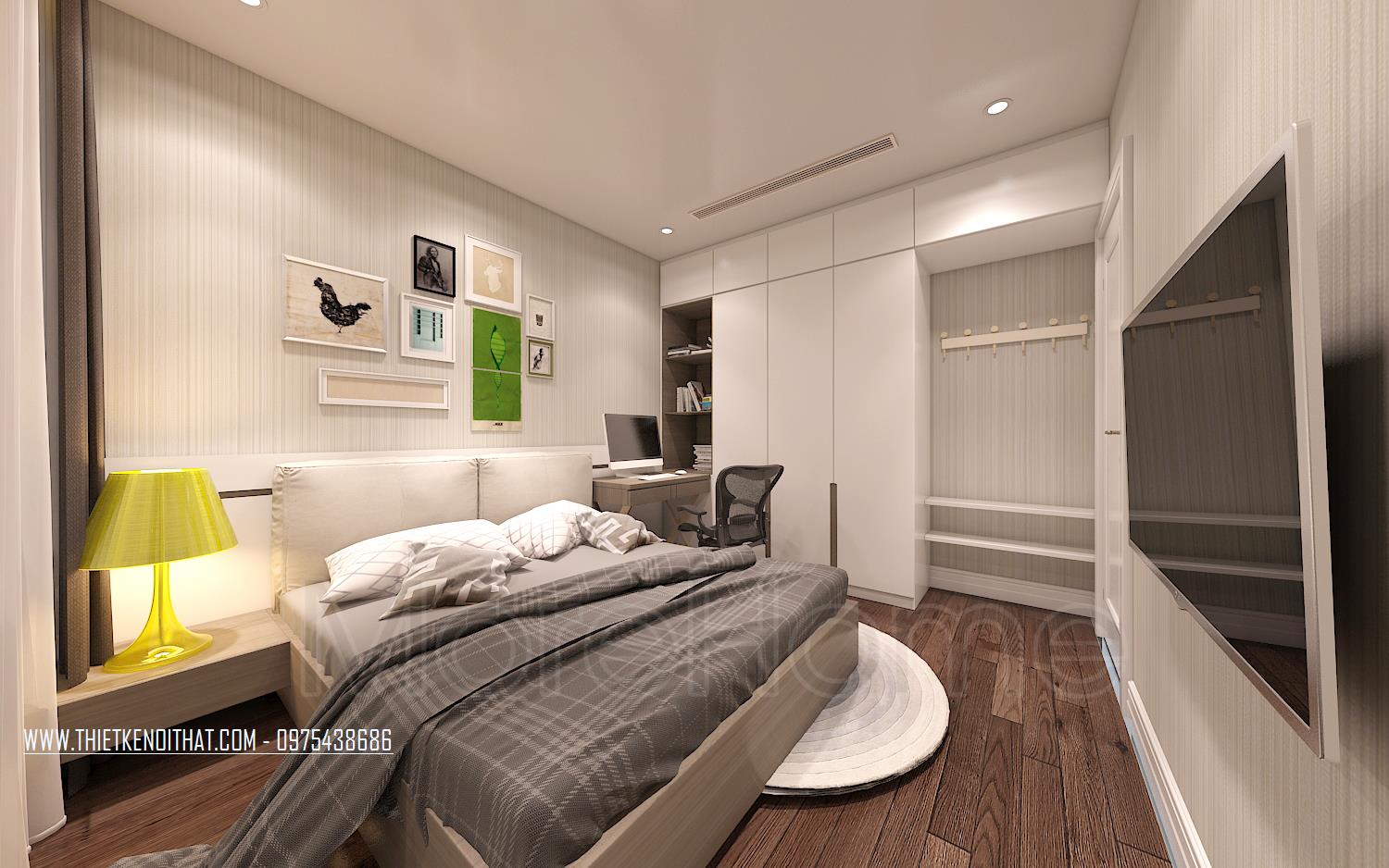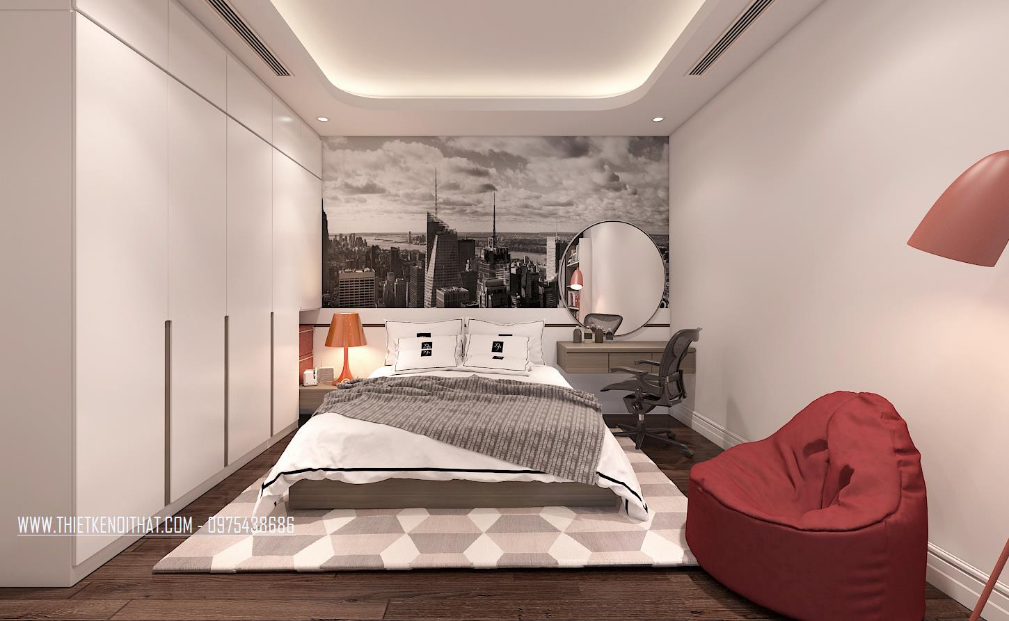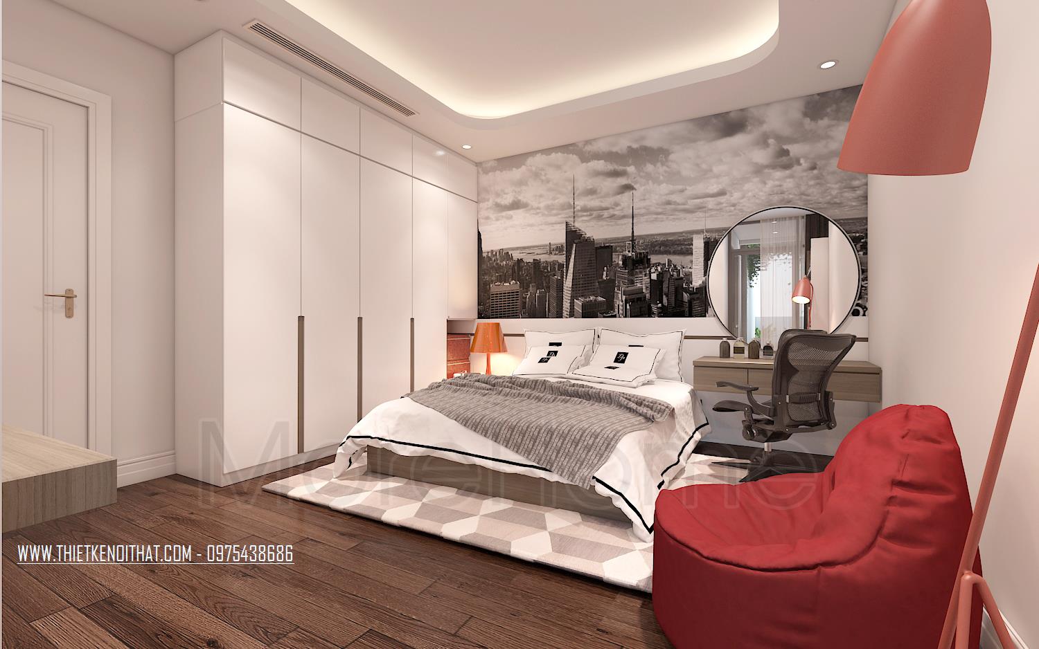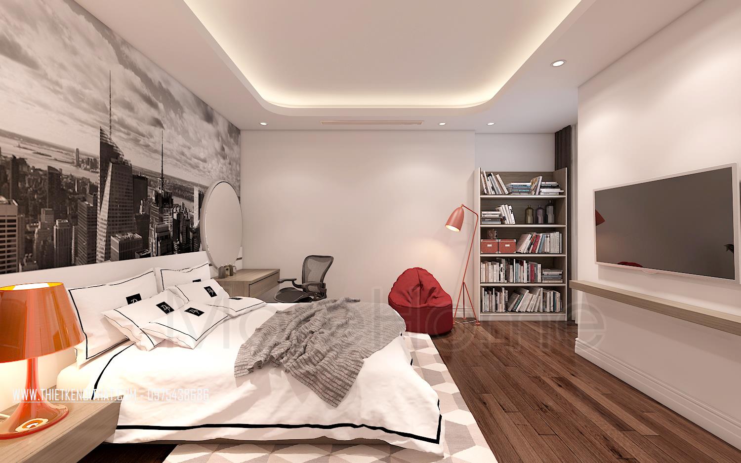 Trong thiết kế nội thất phòng ngủ Master lấy tông màu trắng đen làm tông màu chủ đạo và bức tranh treo tường đen trắng tạo cảm giác hiện đại, thanh lịch cho căn phòng. Giải pháp đèn hắt trần cũng là một chi tiết thú vị giúp căn phòng càng sành điệu hơn gia chủ tùy ý hiệu chỉnh màu sắc theo ý thích của mình. Bên cạnh đó một vài chi tiết nhỏ lại như chiếc đèn ngủ màu cam, chiếc ghế đơn màu đỏ và chiếc đèn cách điệu cũng là một điểm nhấn màu sắc khiến cho căn phòng trở nên sống động mà không bị chìm vào u buồn của đen và trắng.