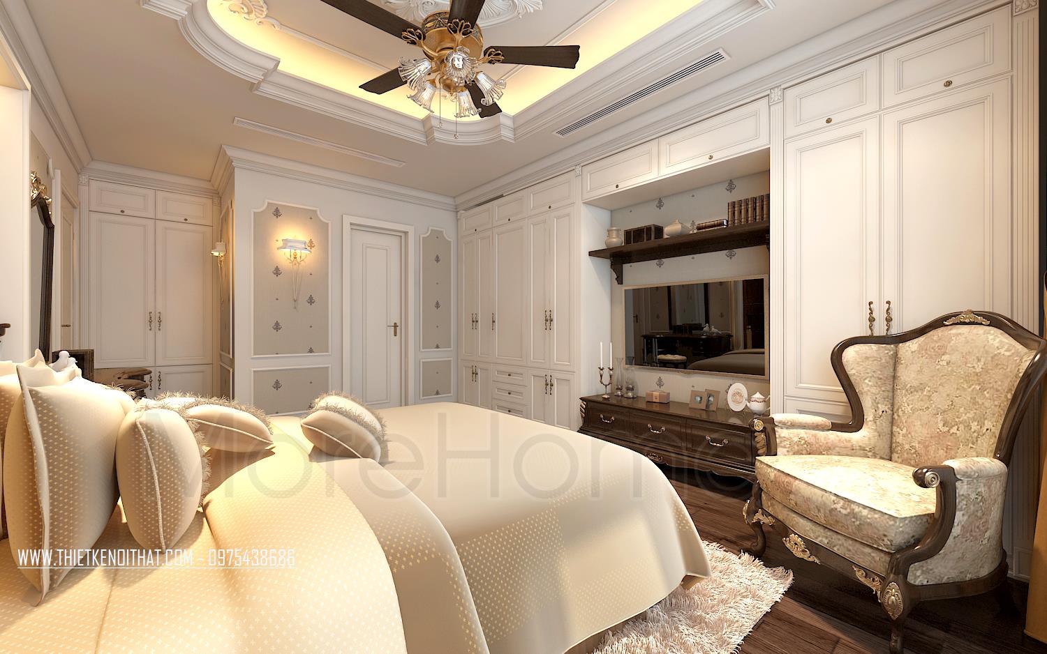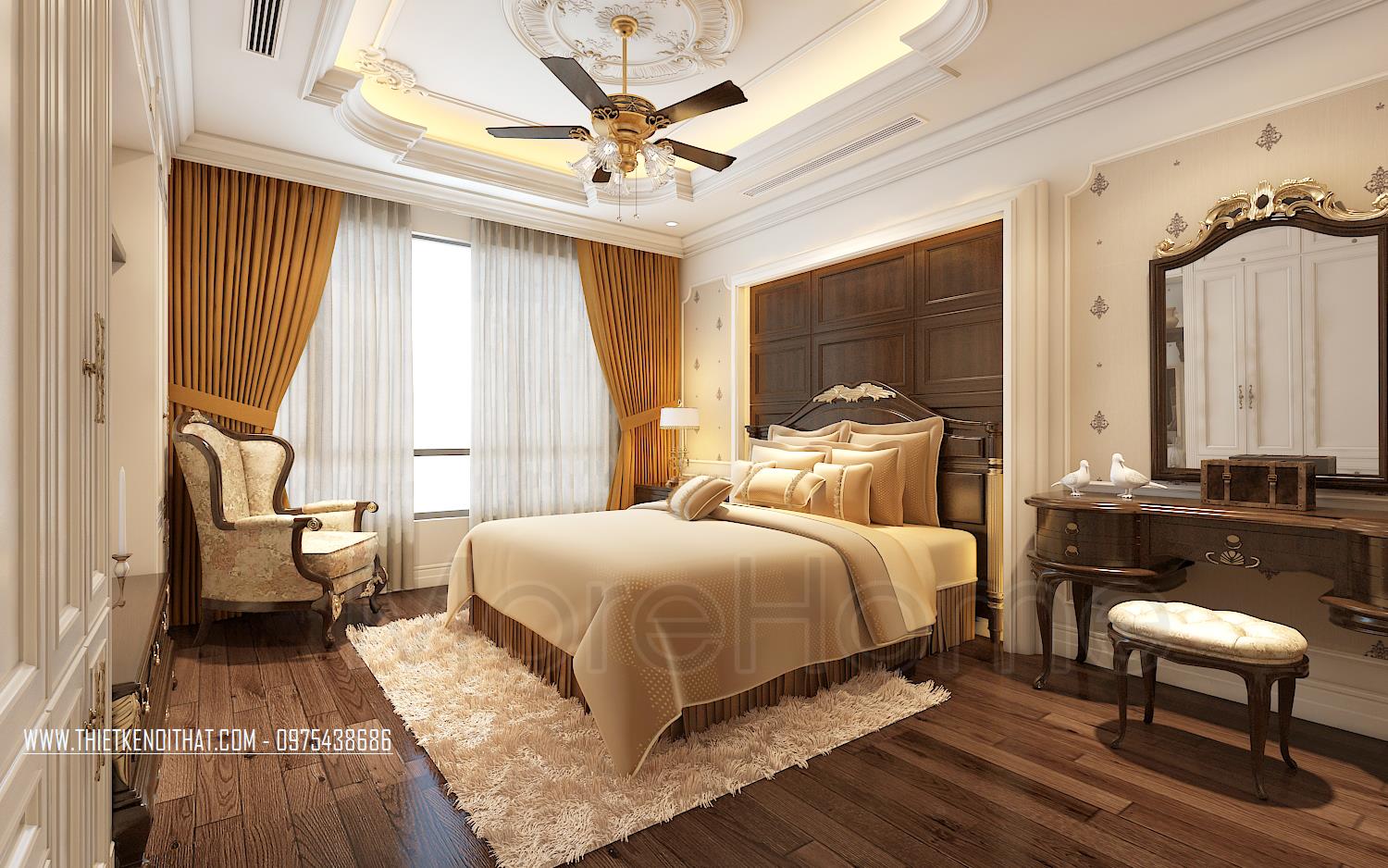 Sang đến thiết kế nội thất phòng ngủ chính của bố mẹ lại là sự kết nối của gam màu cổ điển giữa trắng và vàng gold tạo cảm giác vương giả đến từ các chi tiết rèm cửa, và giường mang phong cách quý tộc. Chiếc ghế tựa giải trí cùng kiểu thiết kế với ghế sofa phòng khách cũng giúp căn phòng mang dáng dấp quý tộc châu Âu lịch lãm xưa kia. Ngoài ra chiếc thảm lông trắng dưới giường cũng phần nào tôn thêm sự quý phái cho căn phòng.
