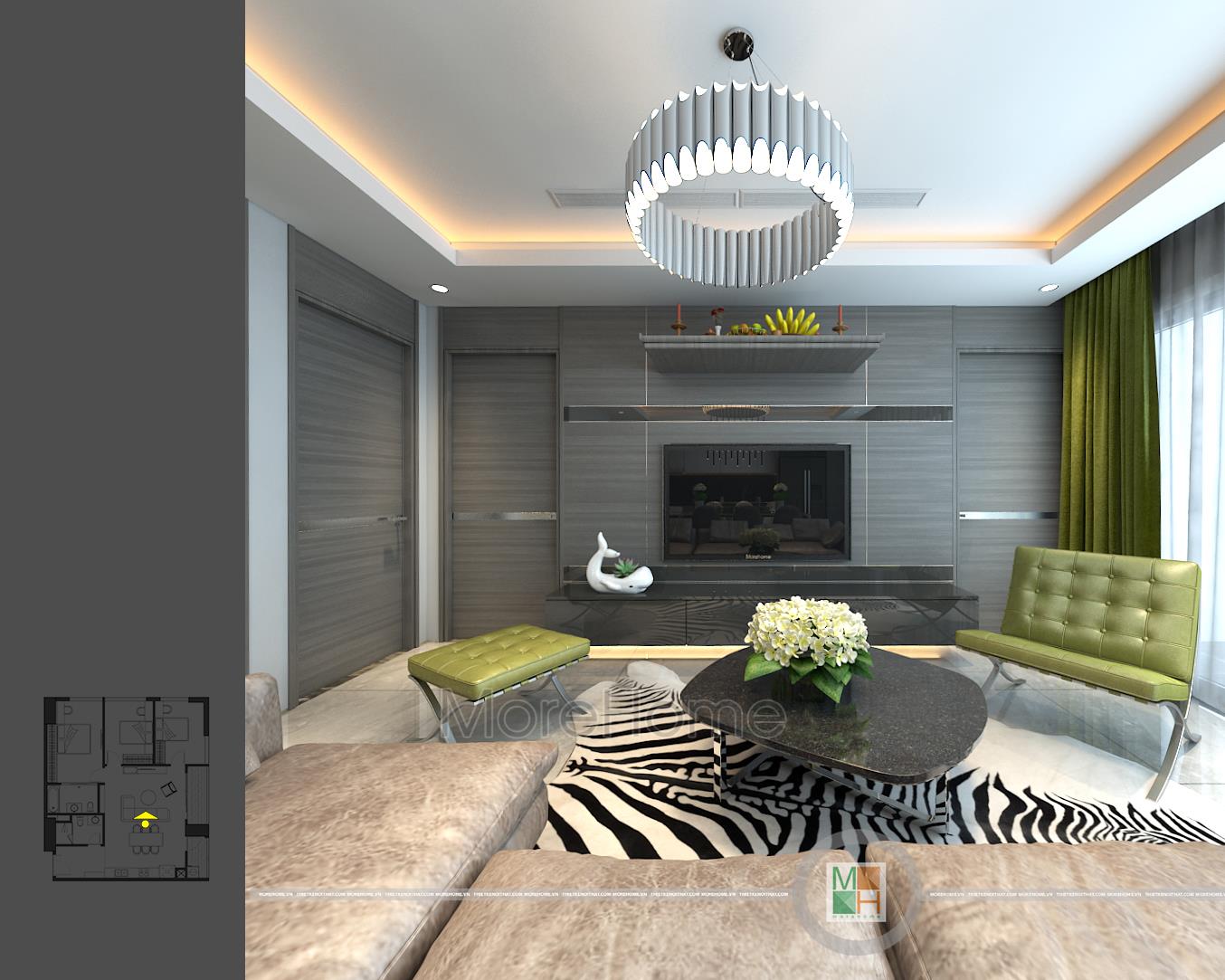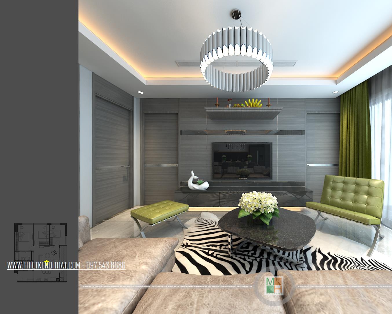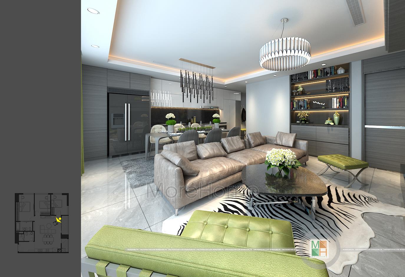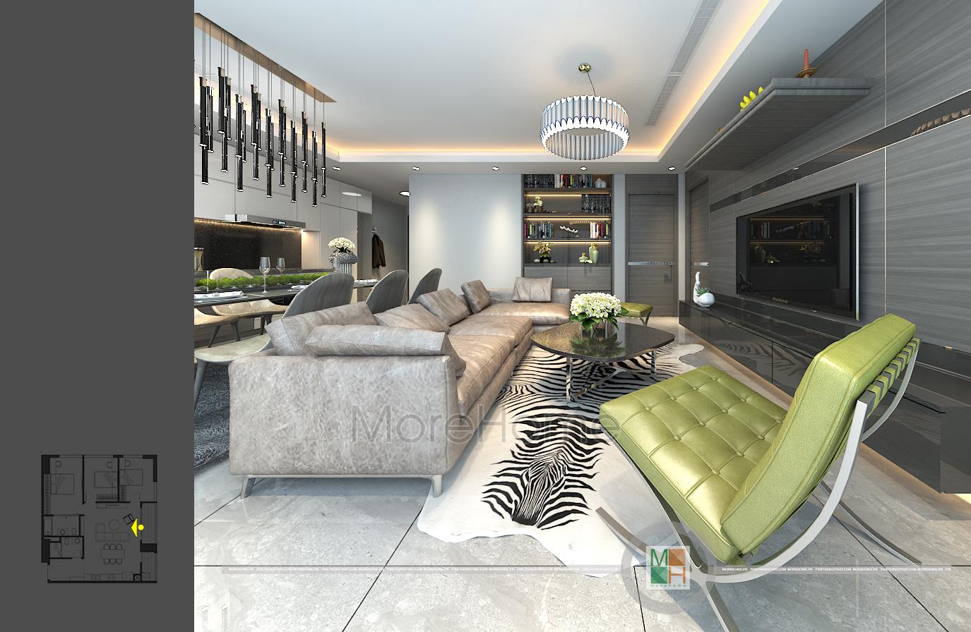 Thấm nhuần tư tưởng xuên suốt của khu chung cư cao cấp này các kiến trúc sư Morehome đã thiết kế căn hộ mẫu chung cư Imperia Garden theo phong cách hiện đại pha một chút tân cổ điển nhẹ nhàng mang “vườn” vào từng không gian sống. Bắt đầu từ phòng khách là một không gian sinh hoạt chung với bộ sofa bọc da sang trọng thêm vào đó điểm nhấn cá tính từ tấm thảm trải sàn da thú cá tính. Không những thế phòng khách còn ấn tượng bởi những chiếc ghế màu xanh lá và hệ thống đèn trang trí hiện đại đầy phá cách. Đặc biệt các kiến trúc sư đã tinh tế khi thiết kế không sử dụng lặp lại cùng một loại đèn trang trí trong không gian sinh hoạt chung này. Vừa đa dạng, vừa tạo điểm nhấn cho không gian nhỏ như bếp nấu, bàn ăn … mà cũng không bị rối mắt. Đó được gọi là nghệ thuật sắp đặt
