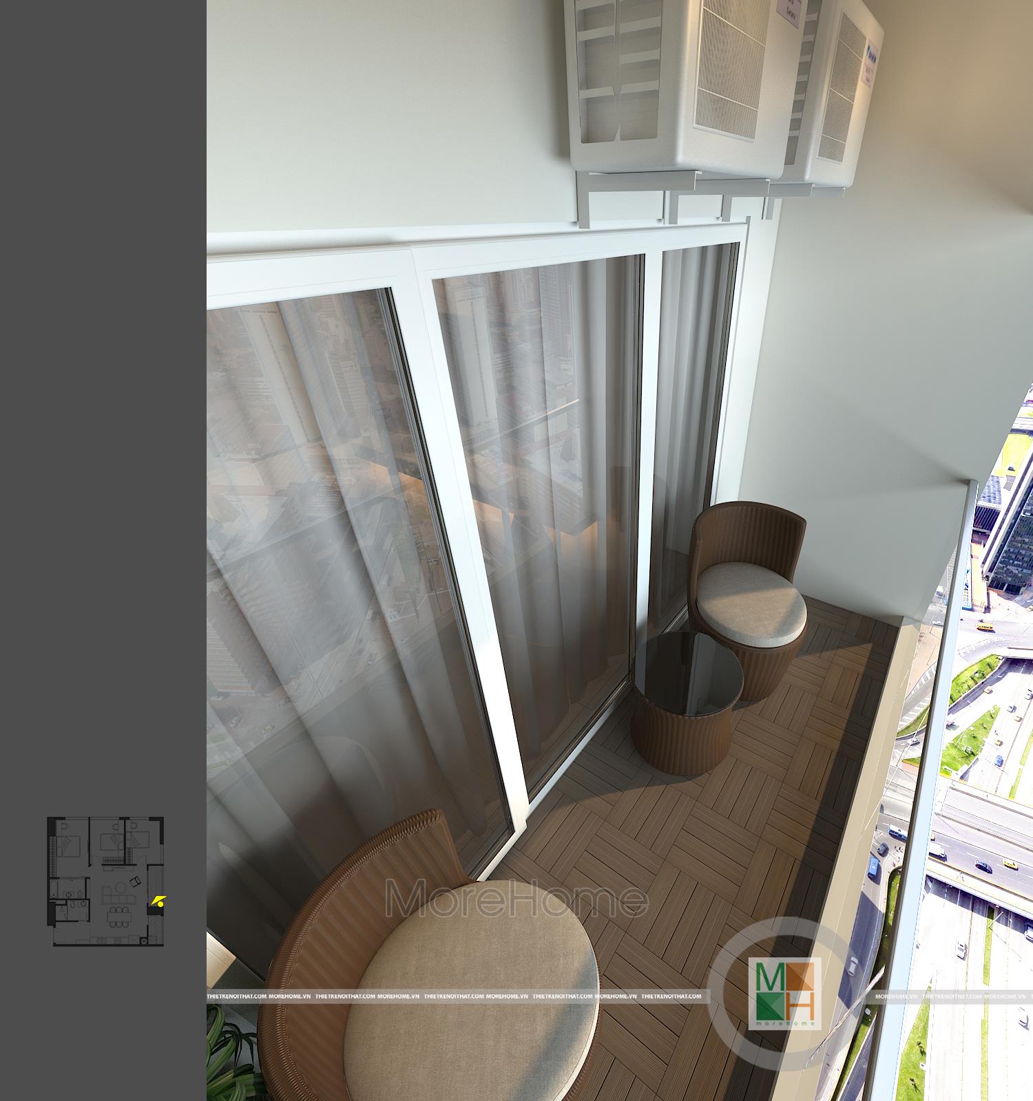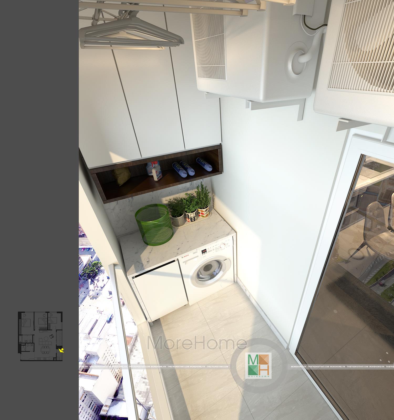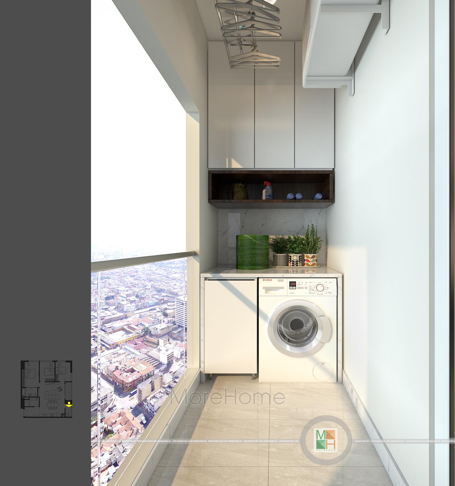 Logia của căn hộ chung cư này thoáng đãng khá rộng rãi được tận dụng làm nơi giặt đồ. Bên trên máy giặt còn được lắp tủ đồ để để đồ linh tinh khác. Một phía logia khác được tận dụng làm không gian thư giãn với bộ bàn ghế thiết kế ấn tượng. Mỗi sáng sớm thức dậy ngồi đây nhâm nhi một tách trà hoặc café thì thật tuyệt vời quá rồi.