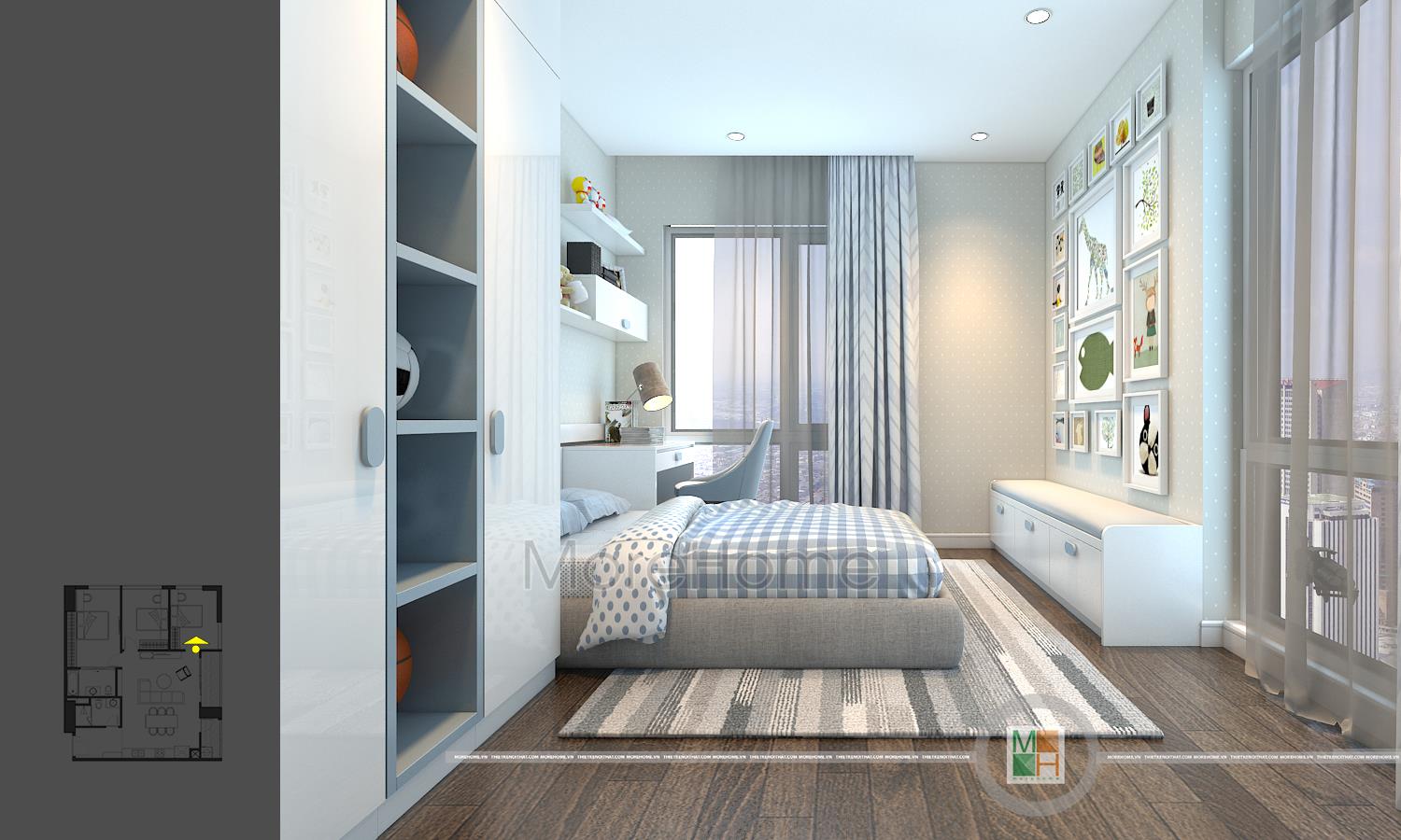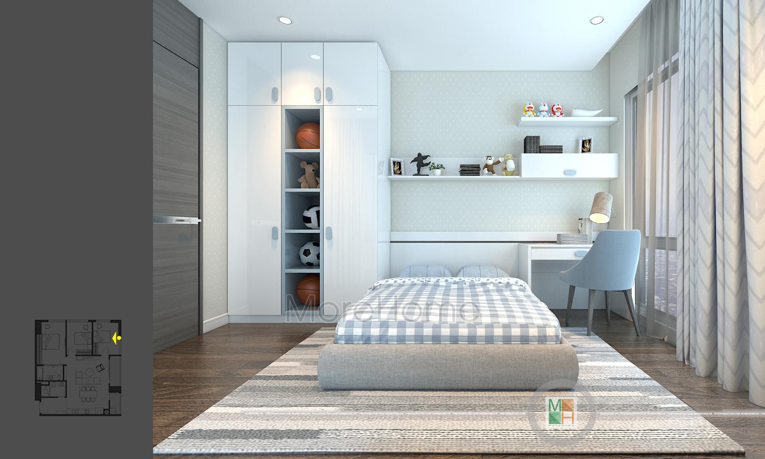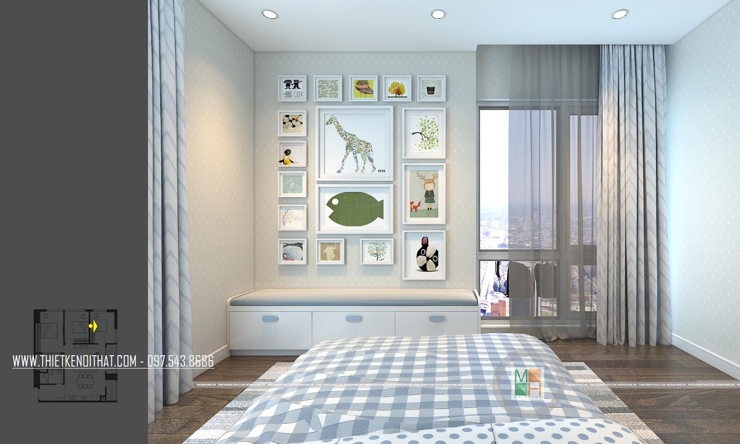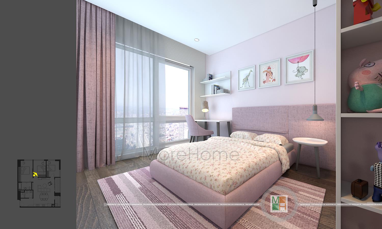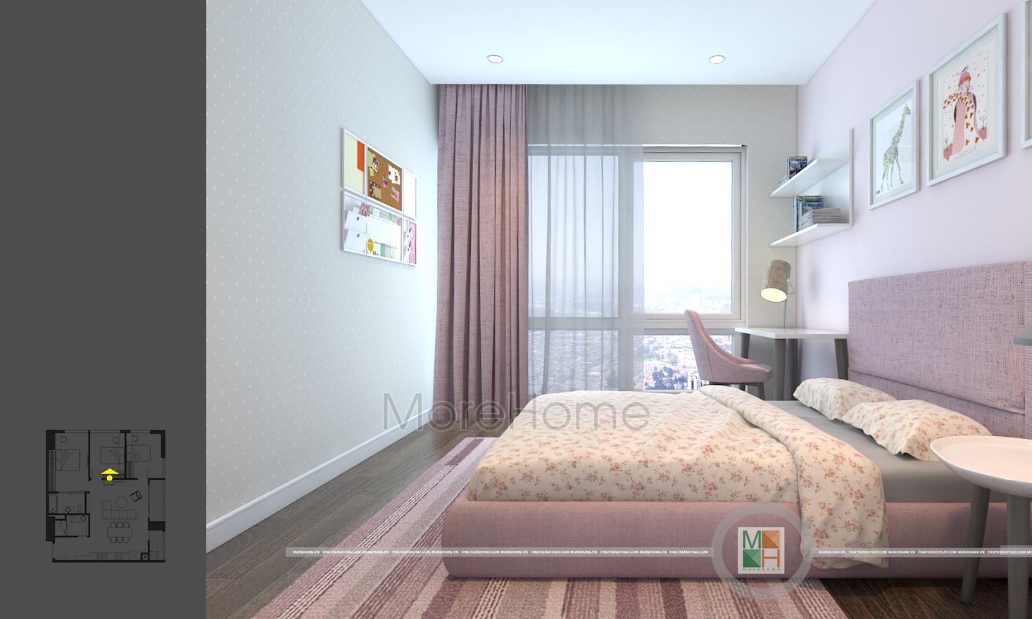 Thiết kế nội thất phòng ngủ trẻ em với 2 phòng, một phòng ngủ bé trai với tông màu xanh nhẹ nhàng và một phòng ngủ bé gái với tông màu hồng đáng yêu. Phòng ngủ bé trai có diện tích rộng hơn nên được bố trí thêm một chiếc kệ tủ trang trí, bàn học của 2 bé đều được đặt cạnh cửa sổ tạo môi trường tốt nhất cho các bé học tập.