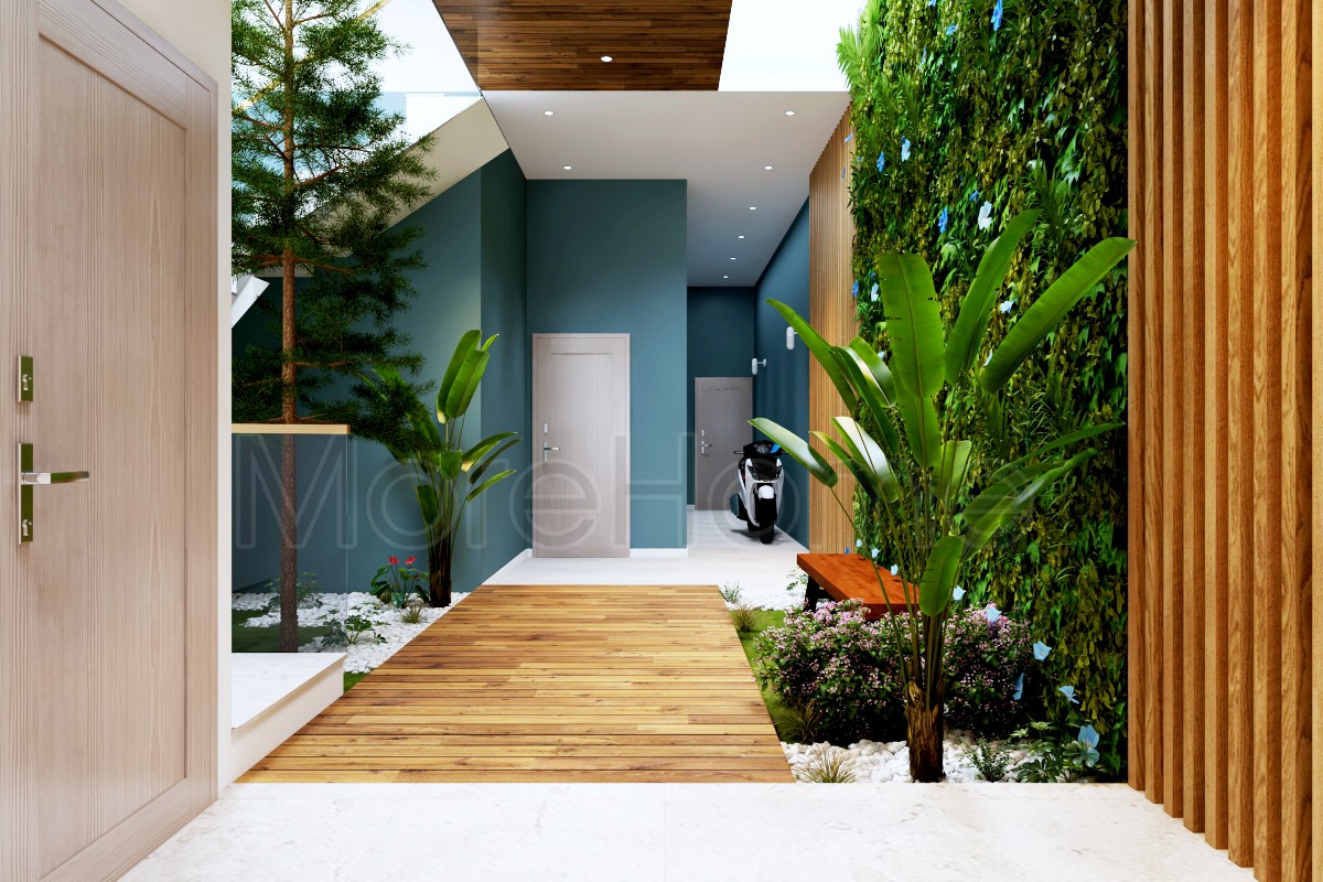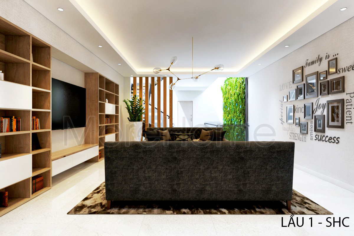 Thiết kế nội thất nhà phố tại Rạch Giá, Kiên Giang sử dụng gỗ óc chó trong thiết kế nội thất, kết hợp màu sắc tươi sáng, trẻ trung thể hiện được cá tính của gia chủ.