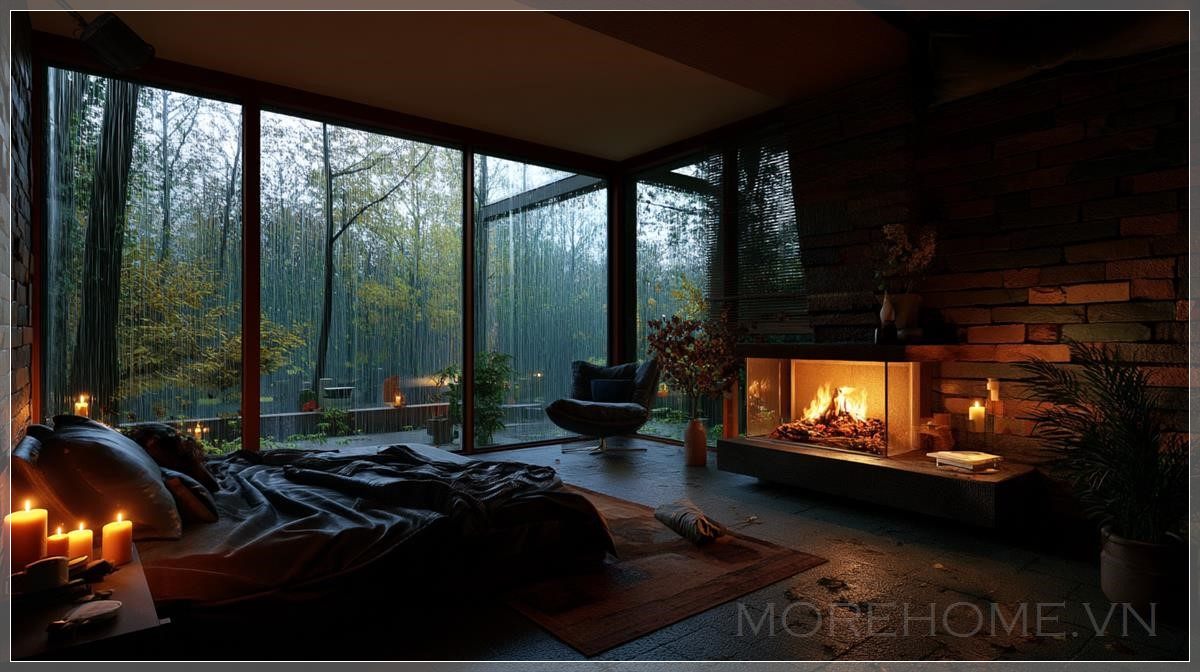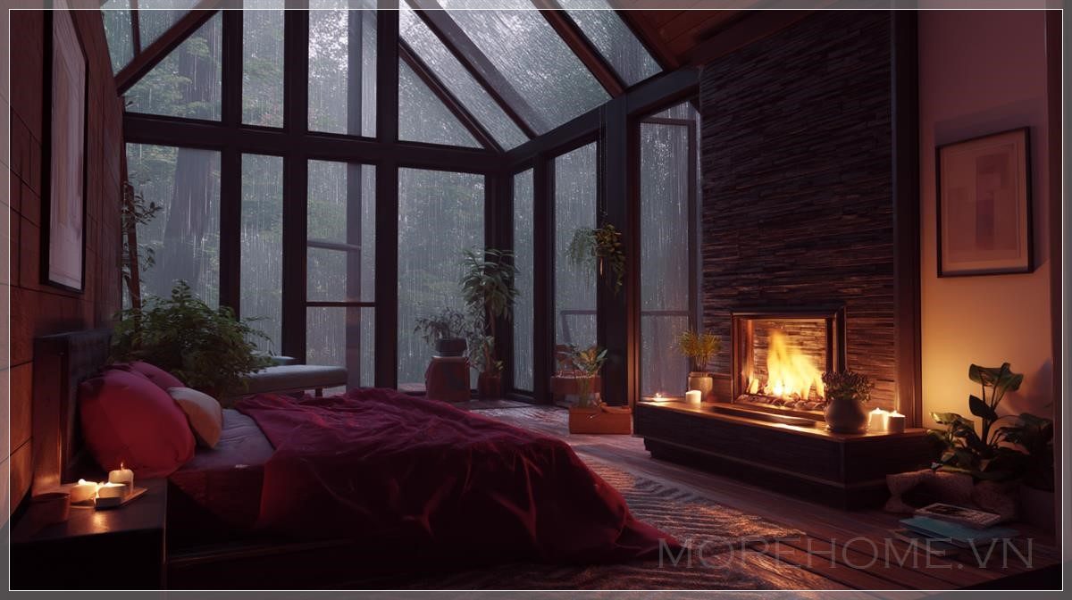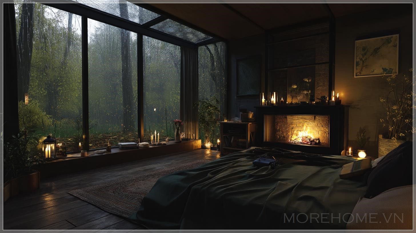 Phòng ngủ ấm cúng, được chiếu sáng bởi những ngọn nến ấm áp và lò sưởi đang cháy. Những cửa sổ từ trần đến sàn mở ra một khu rừng mưa bên ngoài. Cảnh vật mang phong cách bán thực tế, giống như được render trong Blender. Màu sắc bão hòa. Rendered trong Blender và theo phong cách nghệ thuật trò chơi 2D, Sims 3, độ phân giải 32k UHD.