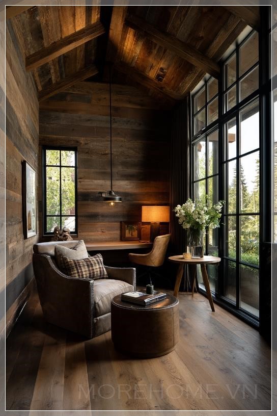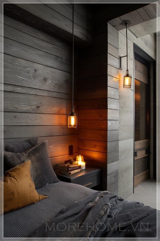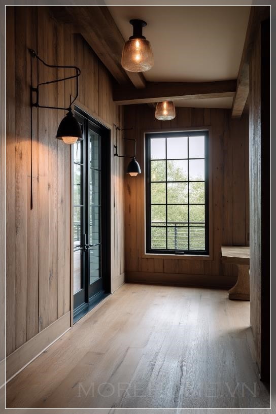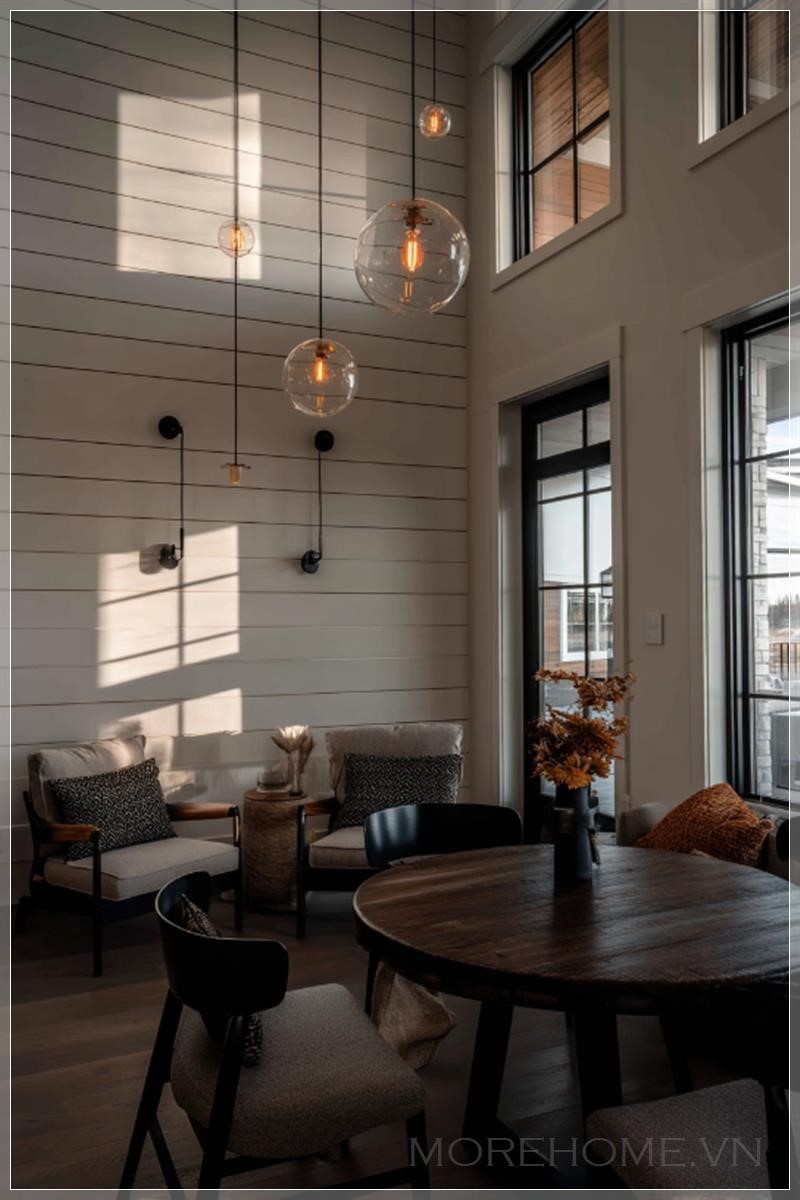 Shiplap, với những ván gỗ xếp chồng lên nhau theo một cách thức đặc biệt, tạo ra một kết cấu tinh tế nhưng mạnh mẽ. Màu gỉ sắt của gỗ tự nhiên cùng với ánh sáng ấm tạo nên một không gian vừa hiện đại vừa mộc mạc, mang đến cảm giác bình yên, dễ chịu. Khi kết hợp với các yếu tố trang trí như đèn treo hay các món đồ nội thất tối giản, không gian này trở thành một nơi lý tưởng cho gia đình tụ họp và thư giãn.