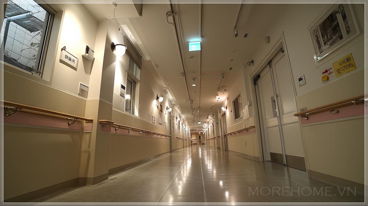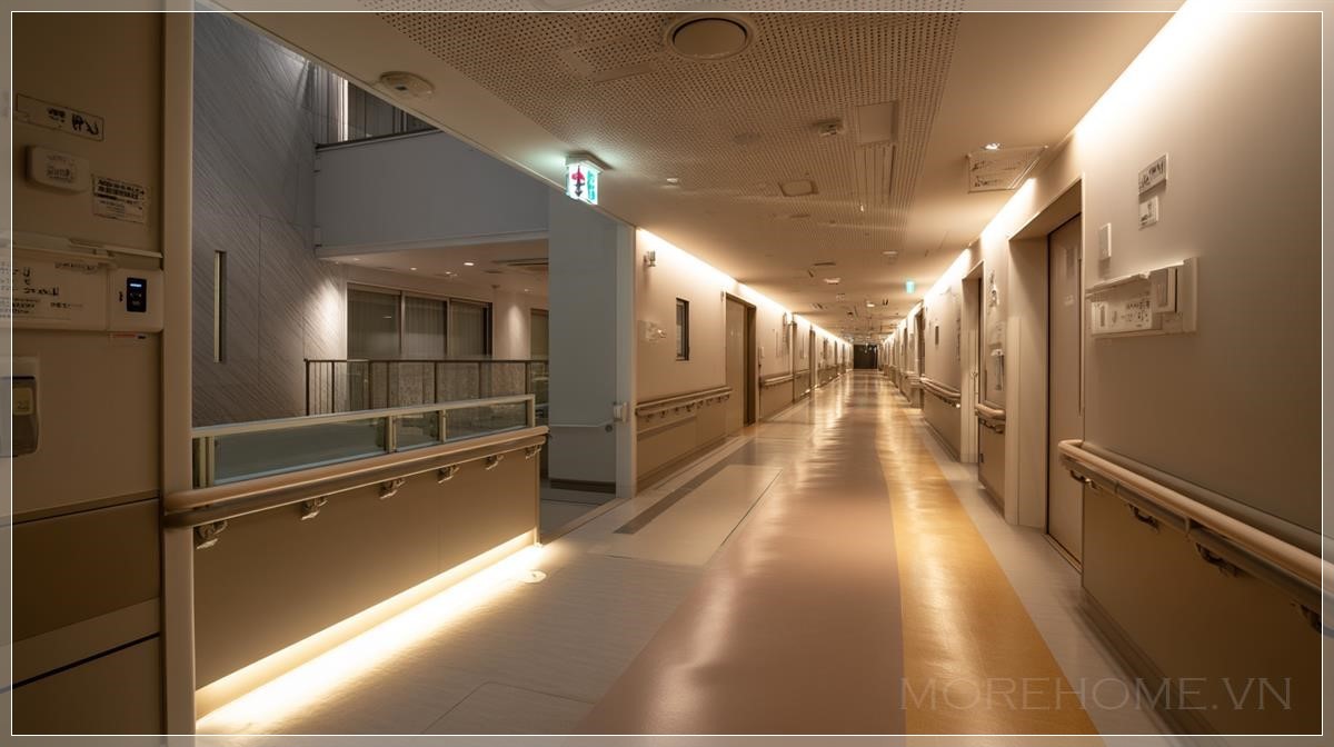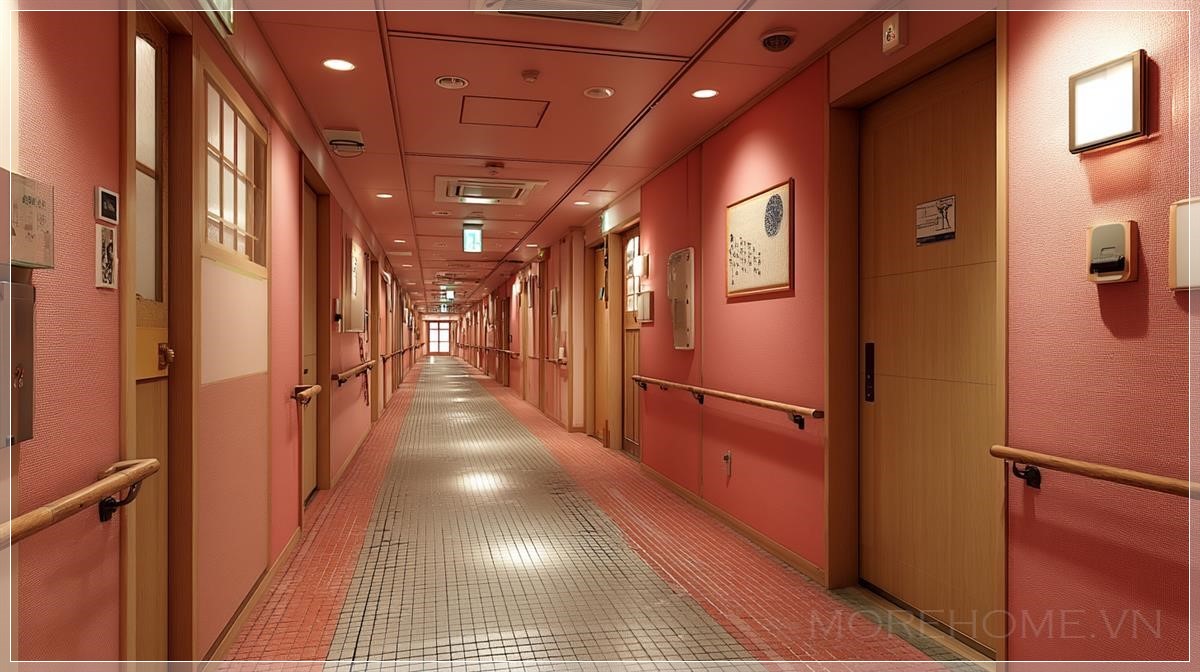 Với phong cách tối giản đặc trưng của Nhật Bản, thiết kế hành lang này không chỉ tập trung vào tính tiện nghi mà còn tạo nên một không gian thanh tịnh, dễ chịu. Mỗi chi tiết, từ chất liệu gỗ tự nhiên đến ánh sáng, đều được lựa chọn sao cho hài hòa, không gian thoáng đãng và không có sự lộn xộn. Mỗi món đồ nội thất đều có mục đích sử dụng rõ ràng, từ tay vịn cho đến đèn chiếu sáng, đều hướng đến việc hỗ trợ tối đa cho người sử dụng mà không làm giảm đi tính thẩm mỹ của toàn bộ thiết kế.