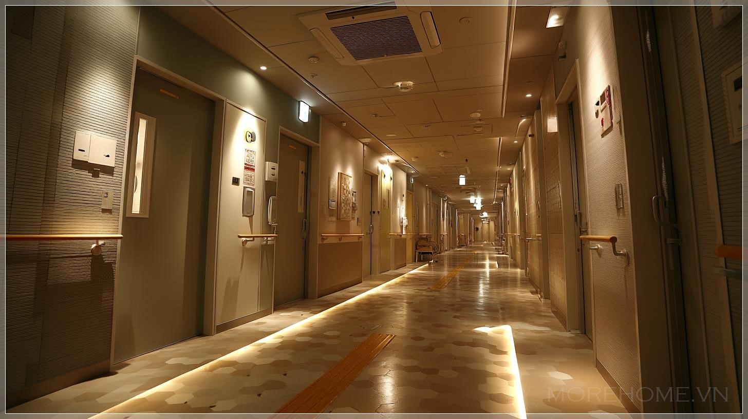 Bên cạnh đó, hành lang còn được trang bị các tính năng hiện đại như đèn dẫn đường LED ở dưới sàn giúp người cao tuổi dễ dàng di chuyển vào ban đêm. Những tay vịn liên tục dọc hành lang không chỉ giúp người dùng cảm thấy an tâm mà còn được tích hợp cảm biến để nhận diện chuyển động, từ đó tăng cường khả năng bảo vệ. Các nút gọi khẩn cấp được bố trí hợp lý trên các bức tường, mang lại sự an toàn cho người dùng trong trường hợp cần hỗ trợ. Đặc biệt, hệ thống camera an ninh AI giấu trong trần nhà giúp giám sát và đảm bảo an toàn mà không làm ảnh hưởng đến thẩm mỹ của không gian.