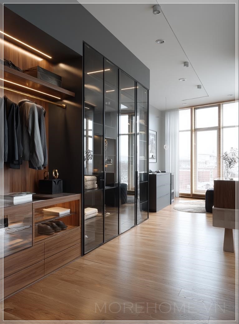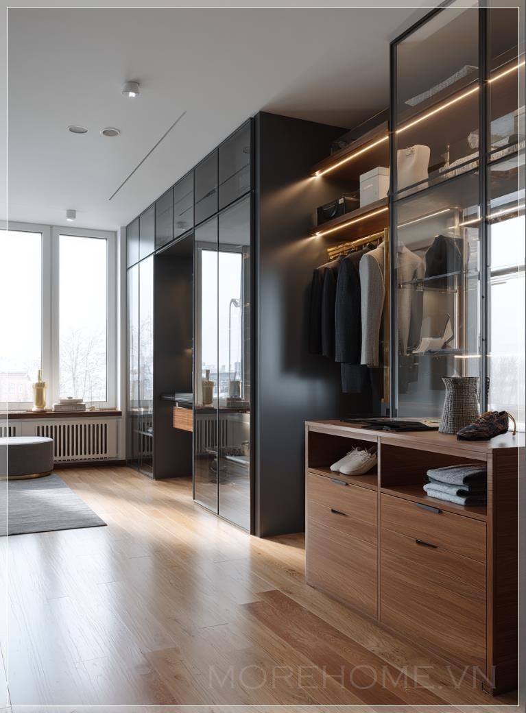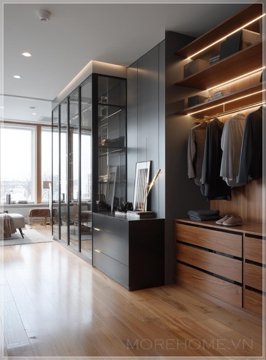 Điểm nổi bật của thiết kế này là sự kết hợp hoàn hảo giữa các vật liệu cao cấp. Tủ đồ sử dụng gỗ tự nhiên, với các tấm gỗ được xử lý tinh tế, tạo ra một cảm giác tự nhiên và gần gũi. Đặc biệt, các kệ gỗ được chiếu sáng từ bên trong, mang lại một không gian không chỉ đẹp mà còn rất tiện dụng. Bên cạnh đó, các cửa tủ được làm bằng kính trong suốt, cho phép bạn dễ dàng nhìn thấy những món đồ phía trong mà không cần mở tủ, giúp tiết kiệm thời gian và tạo sự ngăn nắp.