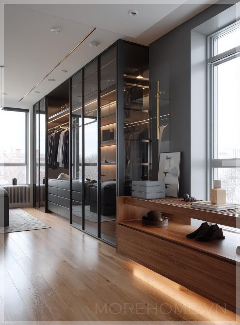 Thiết kế nội thất hiện đại luôn chú trọng vào sự tối giản và tính năng, nhưng không kém phần tinh tế và sang trọng. Một trong những yếu tố quan trọng trong không gian này là sự kết hợp giữa các yếu tố vật liệu, ánh sáng, và màu sắc để tạo ra một môi trường sống thoải mái và dễ chịu. Tủ đồ với màu sắc đen và trắng, điểm xuyết vàng cùng ánh sáng LED, mang đến một không gian hiện đại và thanh lịch, hoàn hảo cho mọi gia đình.