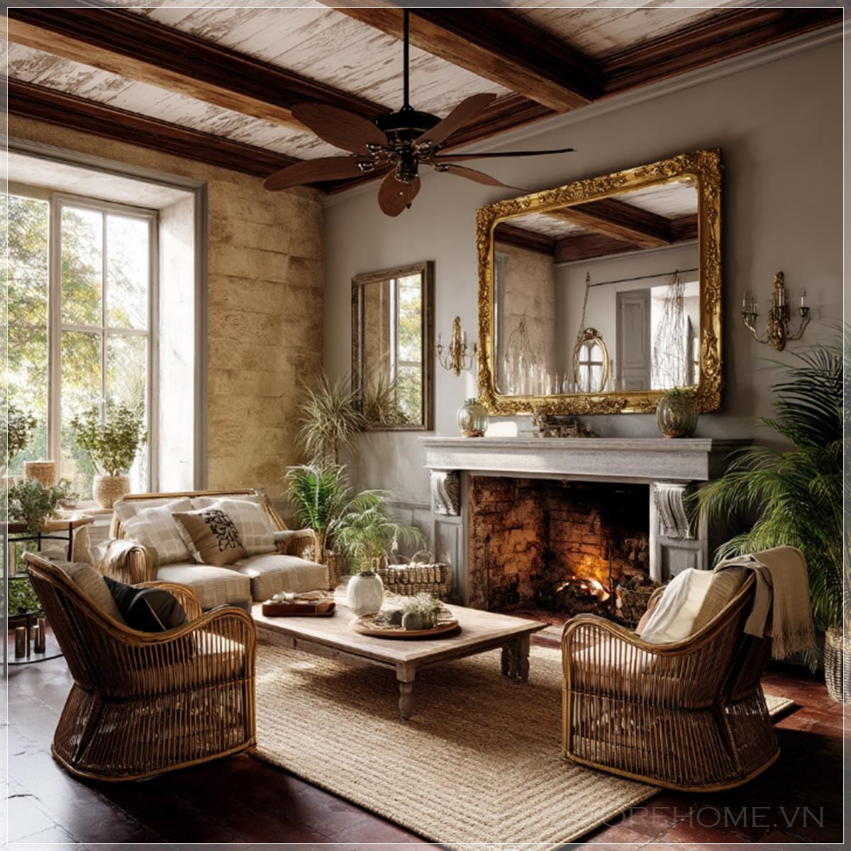 Điểm nổi bật trong thiết kế này chính là sự kết hợp hài hòa giữa các yếu tố tự nhiên và cổ điển. Lò sưởi bằng đá không chỉ tạo nên một điểm nhấn ấn tượng mà còn mang lại sự ấm cúng cho không gian. Ghế bành mây giúp không gian thêm phần thoáng đãng, nhẹ nhàng, đồng thời tạo sự gần gũi với thiên nhiên. Đặc biệt, gương vintage với khung vàng cổ điển là một chi tiết hoàn hảo làm tôn lên vẻ đẹp sang trọng và quý phái cho căn phòng, phù hợp với một không gian sống hiện đại nhưng vẫn giữ được nét tinh tế, cổ điển.