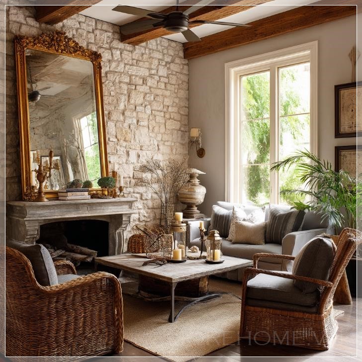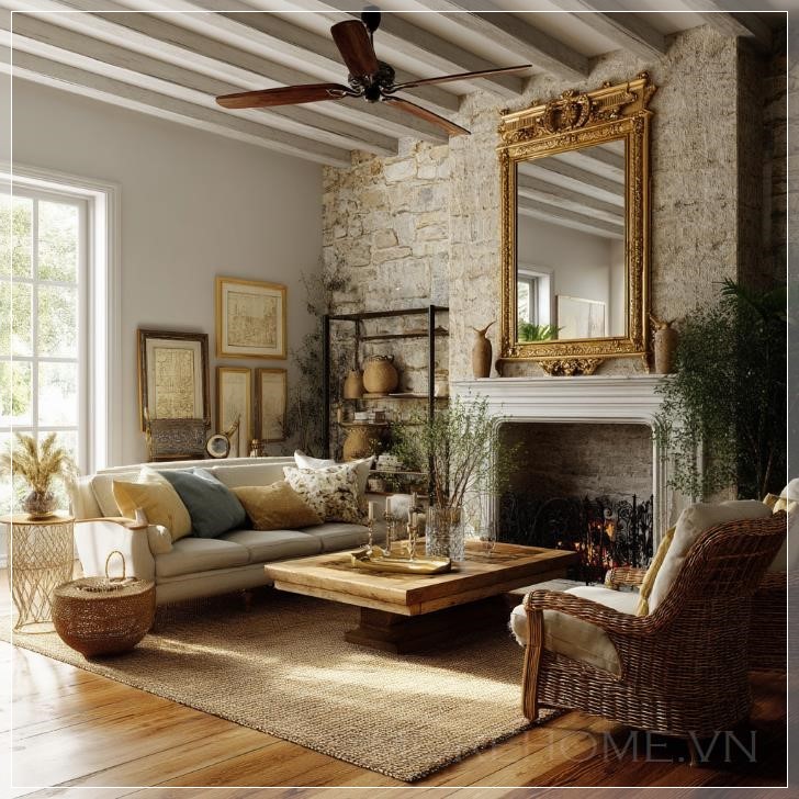 Phòng khách luôn là không gian quan trọng trong mỗi ngôi nhà, là nơi cả gia đình tụ tập, thư giãn và trò chuyện. Chính vì vậy, việc thiết kế một không gian phòng khách vừa thoải mái, vừa đẹp mắt, mang lại cảm giác gần gũi là điều không thể thiếu. Một ví dụ điển hình cho không gian phòng khách mang đậm dấu ấn cổ điển kết hợp mộc mạc chính là phong cách thiết kế phòng khách cottage Pháp. Với các chi tiết như lò sưởi đá, ghế bành mây và gương vintage trong khung vàng tinh xảo, phòng khách này mang đến một không gian đầy ấm áp và sang trọng, đồng thời vẫn giữ được nét mộc mạc của thiên nhiên.