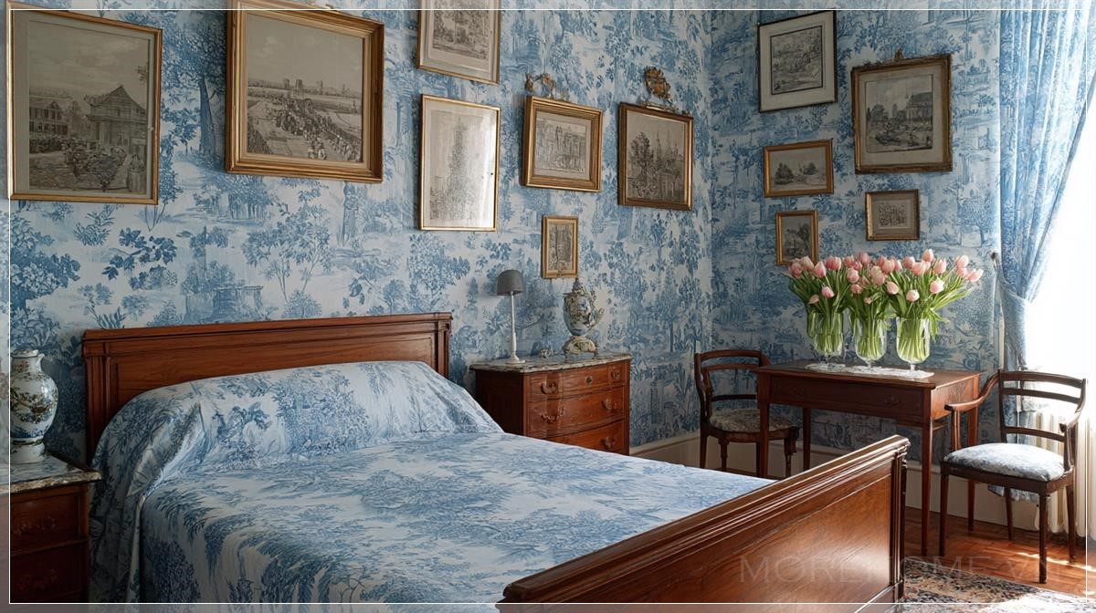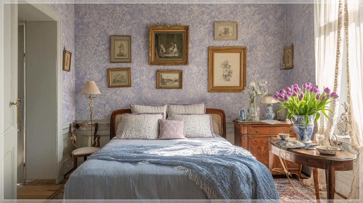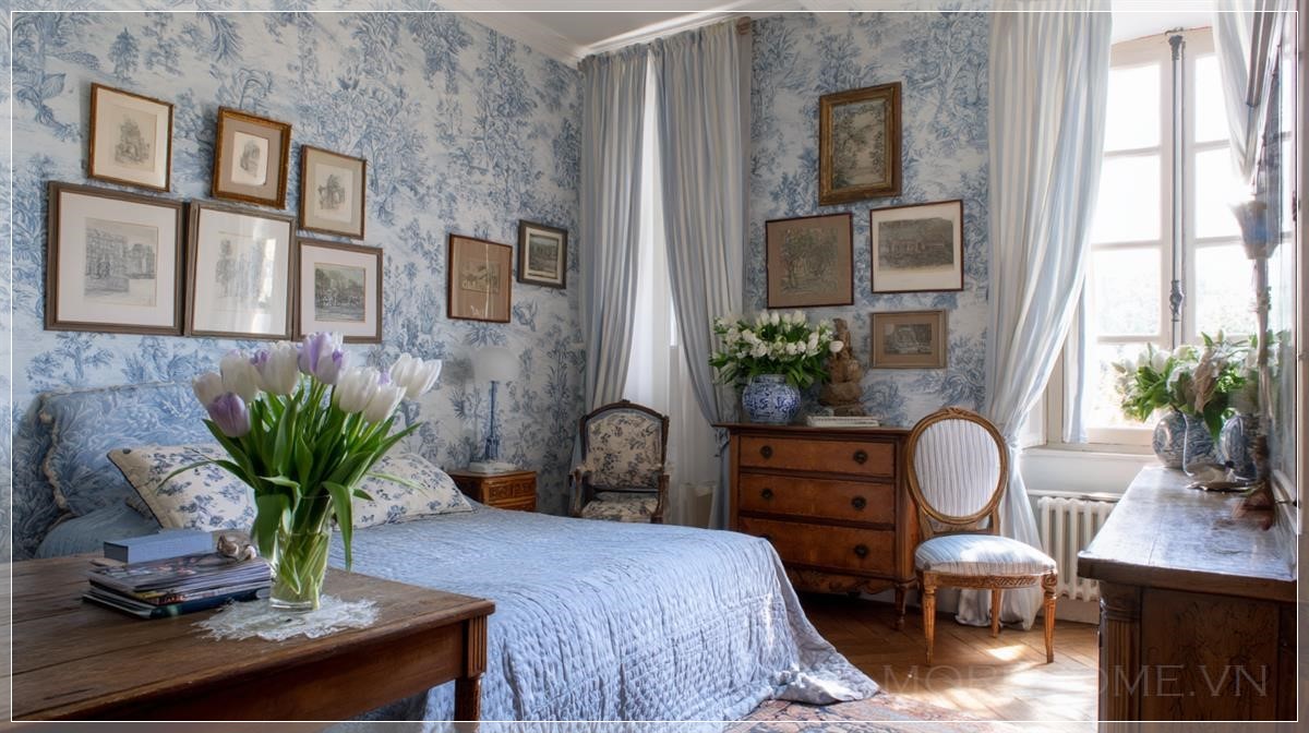Điểm nhấn của thiết kế này là sự kết hợp giữa những họa tiết Toile de Jouy truyền thống và màu sắc hiện đại, tạo nên một không gian vừa cổ điển, vừa đương đại. Màu sắc pastel như xanh dương và tím mang lại cảm giác nhẹ nhàng, thư giãn, rất phù hợp cho phòng ngủ. Gỗ tự nhiên được sử dụng cho các món đồ nội thất như giường, tủ, và bàn trang điểm, đem lại một vẻ đẹp gần gũi nhưng cũng vô cùng tinh tế. Cùng với đó là những chiếc bình hoa tulip tươi mát trên bàn, tạo thêm nét thanh nhã và dễ chịu cho không gian.
