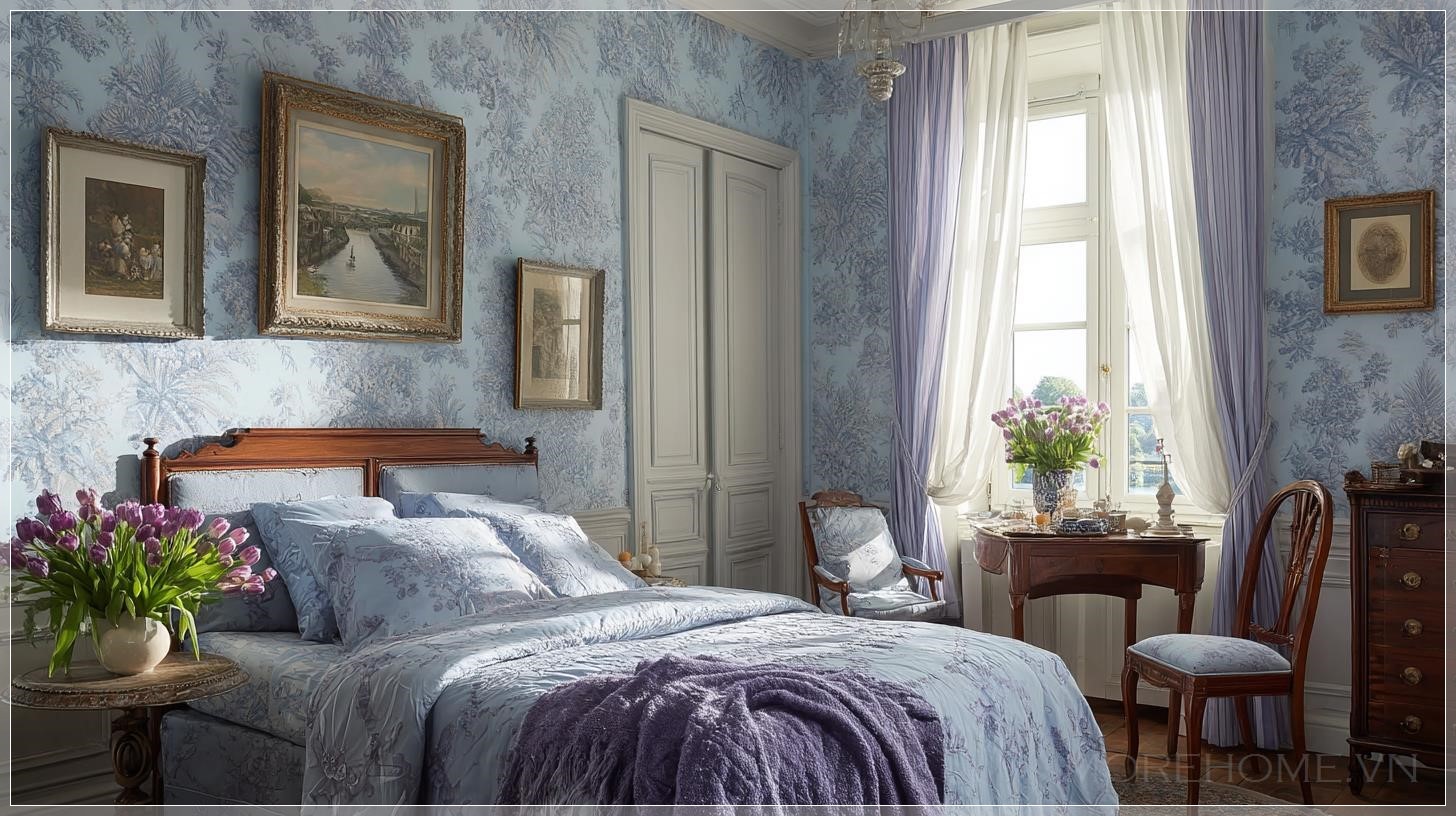 Với sự kết hợp hoàn hảo giữa màu sắc pastel nhẹ nhàng và thiết kế nội thất gỗ tự nhiên, phòng ngủ theo phong cách Pháp mang lại một không gian ấm cúng và thanh thoát. Toile de Jouy với các tông màu xanh dương và tím pastel, cùng với các chi tiết trang trí tinh tế như những bức tranh treo tường, đã tạo nên một không gian không chỉ đẹp mắt mà còn vô cùng thoải mái. Sự lựa chọn vật liệu gỗ tự nhiên cho các món đồ nội thất càng làm tăng thêm vẻ đẹp mộc mạc nhưng không kém phần sang trọng.