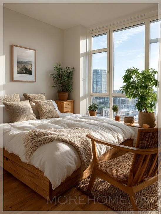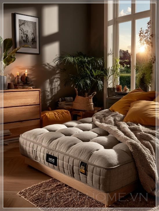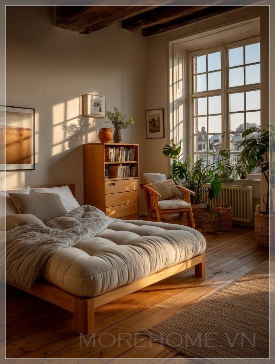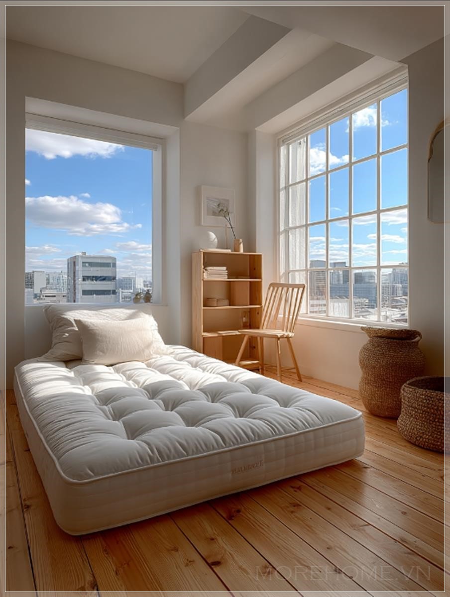 Phân tích thiết kế từ một căn phòng ngủ với những yếu tố tối giản nhưng đầy đủ tiện nghi, ta có thể thấy rõ sự kết hợp giữa các yếu tố không gian, ánh sáng và nội thất đã tạo nên một không gian thư giãn lý tưởng. Bức ảnh mô tả một chiếc giường đơn giản với tấm nệm êm ái, không có chăn hay ga giường, tạo ra một vẻ đẹp thanh thoát, nhẹ nhàng. Sàn nhà được lát bằng gỗ tự nhiên, mang lại sự ấm cúng cho không gian. Bên cạnh đó, ánh sáng từ cửa sổ lớn bên trái không chỉ chiếu sáng căn phòng mà còn giúp không gian như rộng rãi và thoáng đãng hơn.
