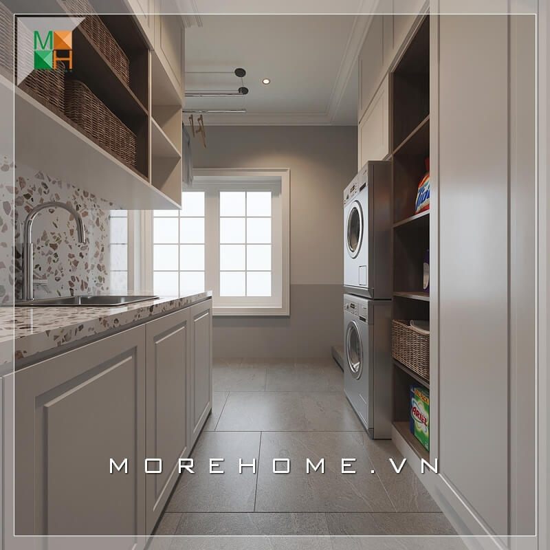 Ngoài điểm đặc biệt từ cách bố trí kệ trang trí, bàn đảo bằng đá granite màu trắng được thiết kế nhô ra ngoài lại là điểm đáng chú ý, một mặt vẫn đảm bảo diện tích để chủ nhân có thể phô diễn món ăn thỏa mái, một mặt bạn lại có thể vừa nội trợ vừa có thể trông nom con học một cách dễ dàng.