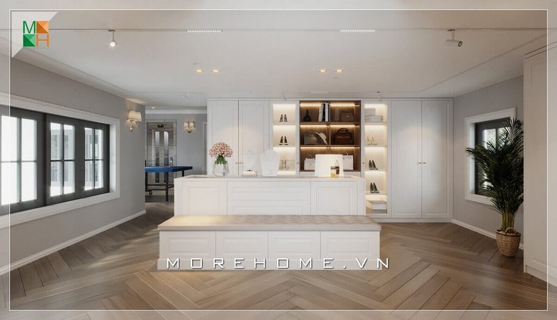 Biệt thự, nhà phố có không gian phòng thay đồ tiện lợi hiện đại và sang trọng với hệ thống tủ âm tường màu trắng trẻ trung, tinh tế.