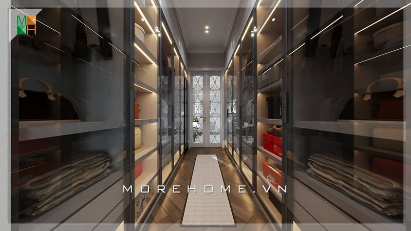 Thiết kế nhà phố có phòng để đồ sang trọng hiện đại, tủ gỗ kết hợp kính ấn tượng.