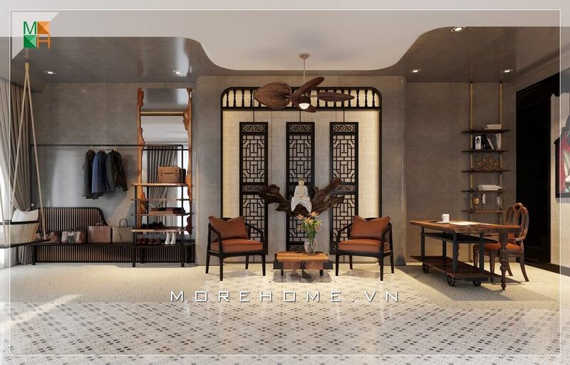 Một mẫu thiết kế nội thất có sự kết hợp liền kề giữa các không gian nhà với nhau tạo nên một sự gắn kết thống nhất mang phong cách Đông Dương quen thuộc hợp cho không gian nhà phố, biệt thự, chung cư.