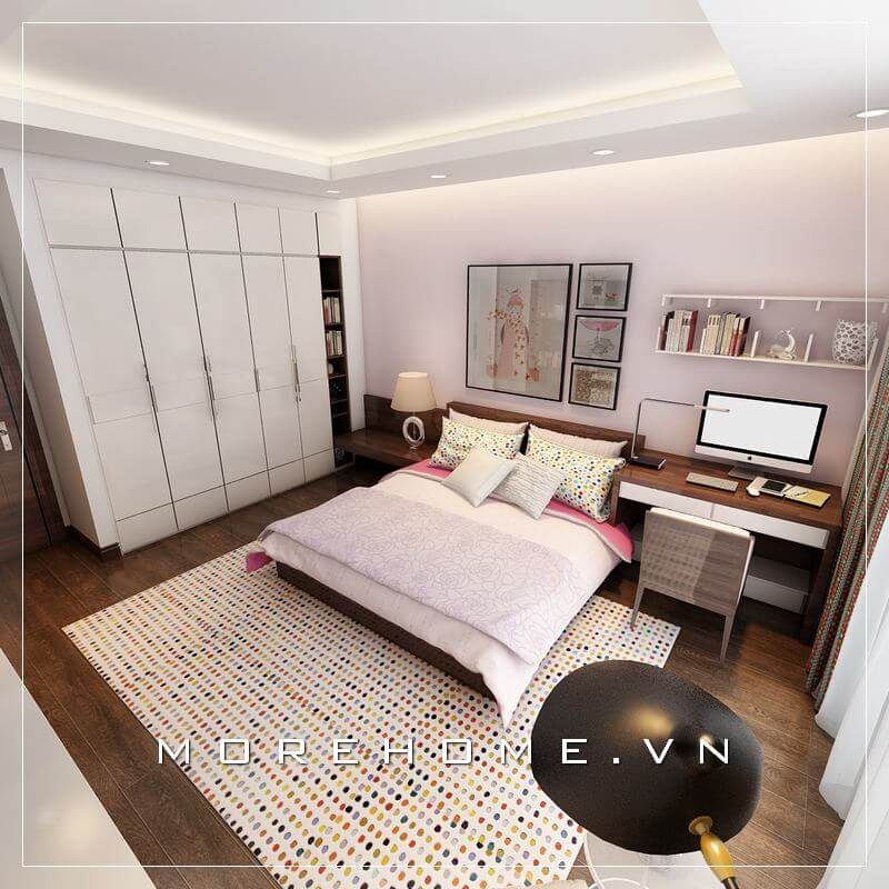 Với tông màu trắng chủ đạo xen vào căn phòng là màu tím của ga giường ngủ hiện đại làm căn phòng trẻ trung và hiện đại hơn.