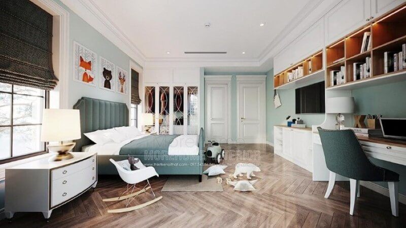 Giường ngủ bọc nệm đẹp nổi bật với sắc xanh kết hợp cùng gam trắng nhẹ nhàng tạo điểm nhấn ấn tượng cho phòng bé trai