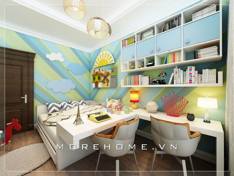 Không gian phòng ngủ cho bé thiết kế với gam màu sắc tươi sáng, đồ nội thất hiện đại