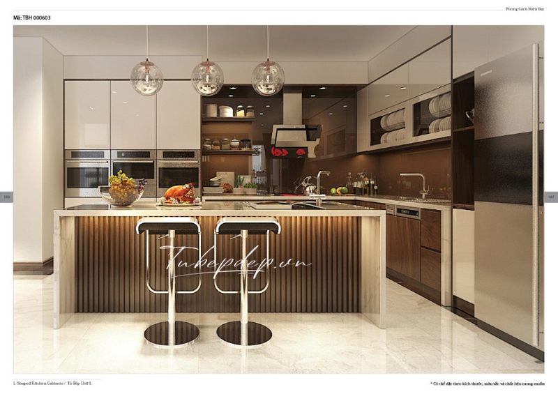 Hệ thống tủ bếp hình chữ L từ gỗ công nghiệp với thiết kế thời thượng được thiết kế để phù hợp với những gia chủ yêu thích phong cách trẻ trung và năng động.
