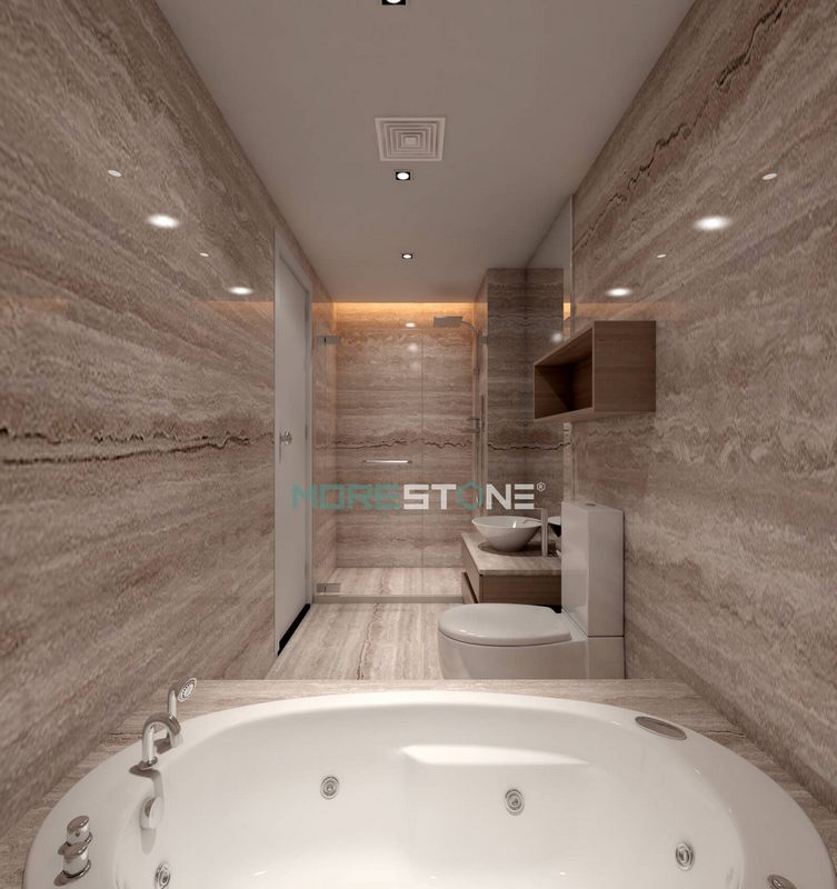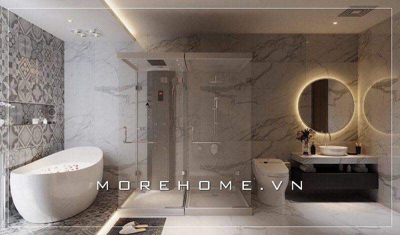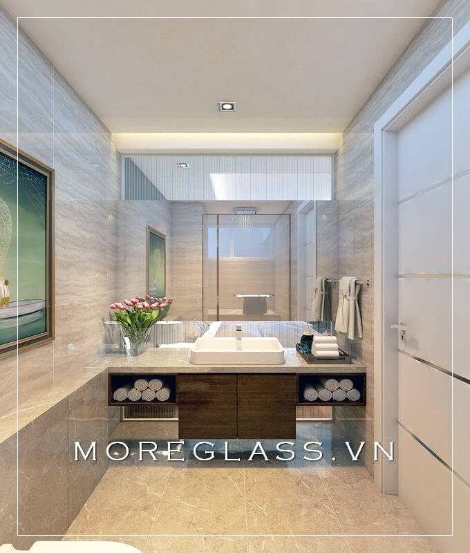 Sử dụng đá tự nhiên cao cấp, ốp nền và tường kết hợp với vách kính tắm cường lực, chúng tôi sẽ tạo ra một không gian hoàn hảo trong từng chi tiết cho mẫu thiết kế phòng tắm đẹp của bạn và phân cách hai không gian nhà vệ sinh và phòng tắm.