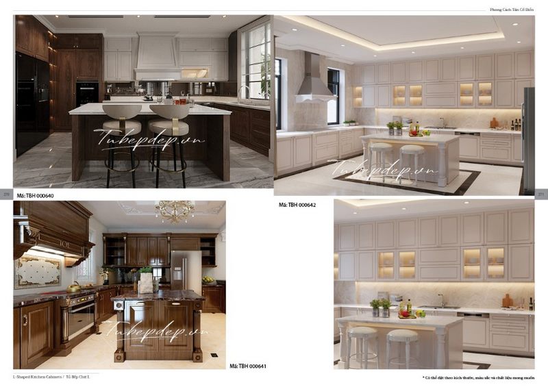 . MoreHome đã thể hiện ra 2 mẫu thiết kế phòng bếp trong cùng một khung hình: một là phòng bếp gỗ óc chó nâu đậm huyền bí và một là phòng bếp tân cổ điển màu trắng dành cho các căn biệt thự, nhà phố.