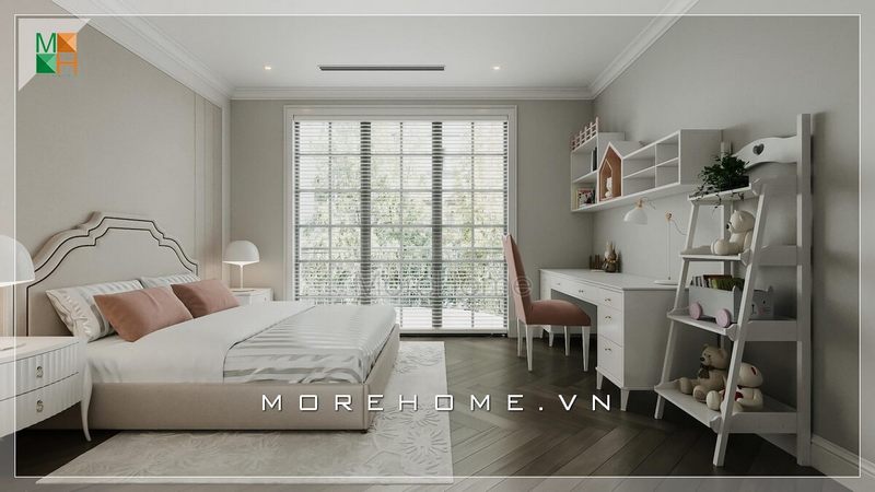 Mẫu phòng ngủ có cửa sổ lớn đón ánh sáng tự nhiên với chiếc giường màu sắc sáng trẻ trung năng động rất ấn tượng.