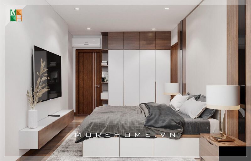 Mẫu thiết kế giường ngủ kiểu dáng hiện đại kèm tab đầu giường đơn giản bằng gỗ tự nhiên, kết hợp sàn gỗ và thảm trải sàn cùng tông màu nâu - xám, mang lại vẻ đẹp hiện đại cho căn phòng